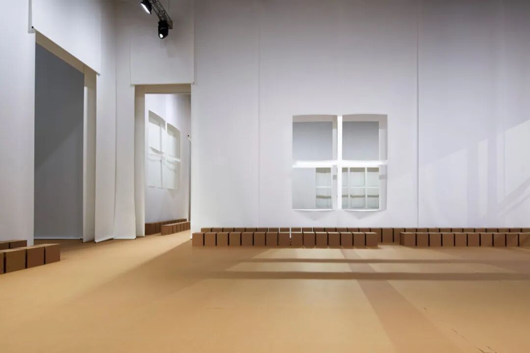 形状像四扇玻璃窗的巨大开口,穿透了展示空间的分层纸墙,并可以看到旁边的房间。