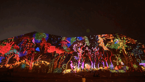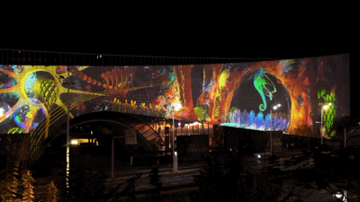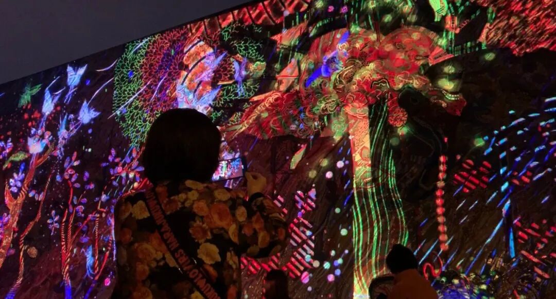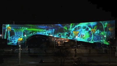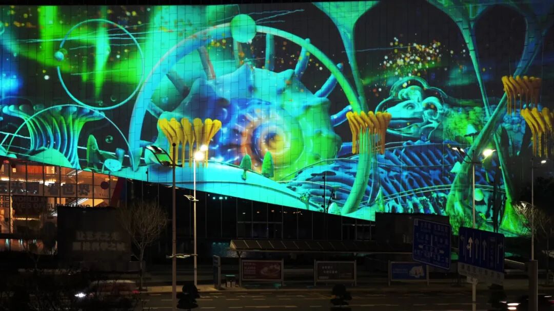 作品在原本载体瓷片画作上进行多媒体创作,色彩斑斓,风格独特,极具艺术气息,本次在原本就极度优秀的建筑艺术载体上,与郝院长的作品灵魂碰撞,在这座巨幅涂鸦墙上进行夜间的光影创作,为涂鸦纹理赋予了动态生命感,延续罗中立美术馆在夜幕降临时的生机及生命力。