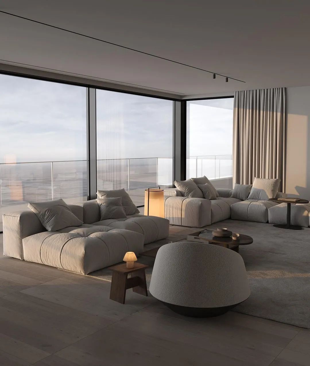 The shape of the sofa is beautiful and comfortable. In order to create a sense of contrast in volume, the designer chose a small tea table to match and create a different aesthetic feeling.The glass compartment is one of the highlights in the space.
