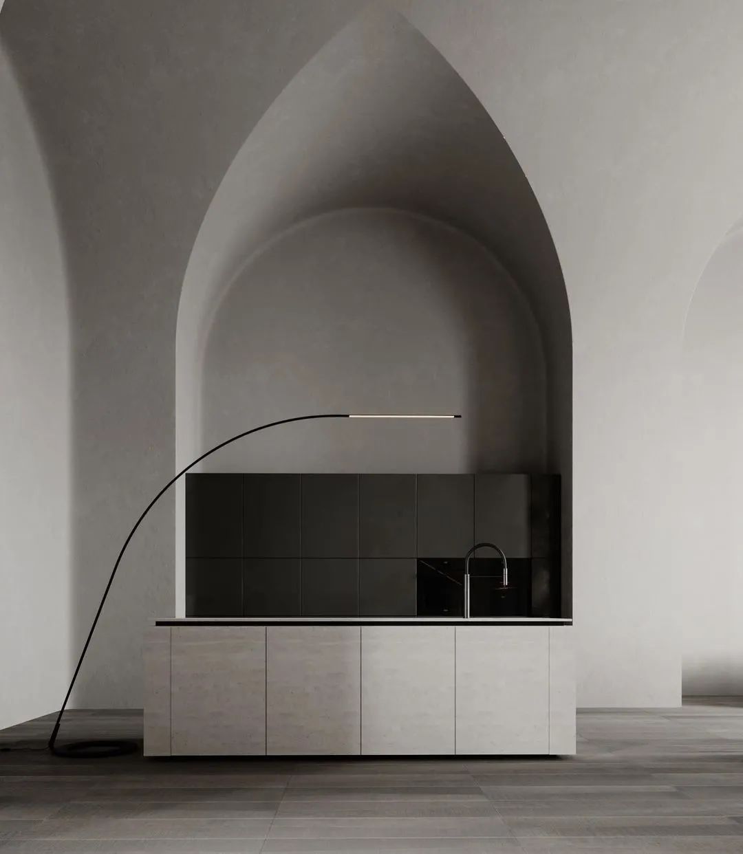 高级灰在空间得到了大量的运用,营造出色彩上的简约效果。在黄色光影的照耀下,空间呈现出了一种高级质感。