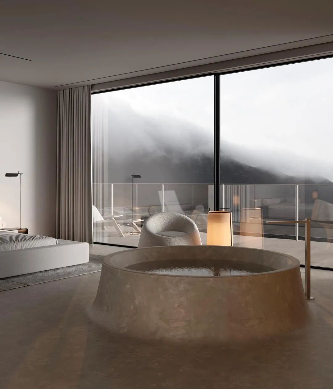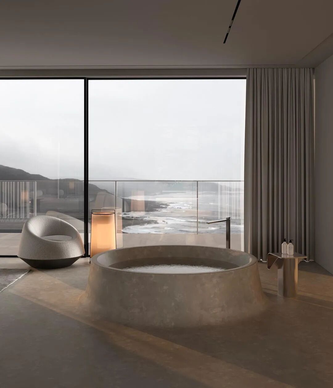 Bathing area, the shape of the bathtub is quite unique. It adds interest to the space.
