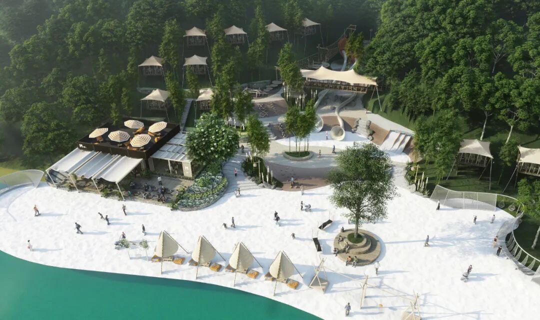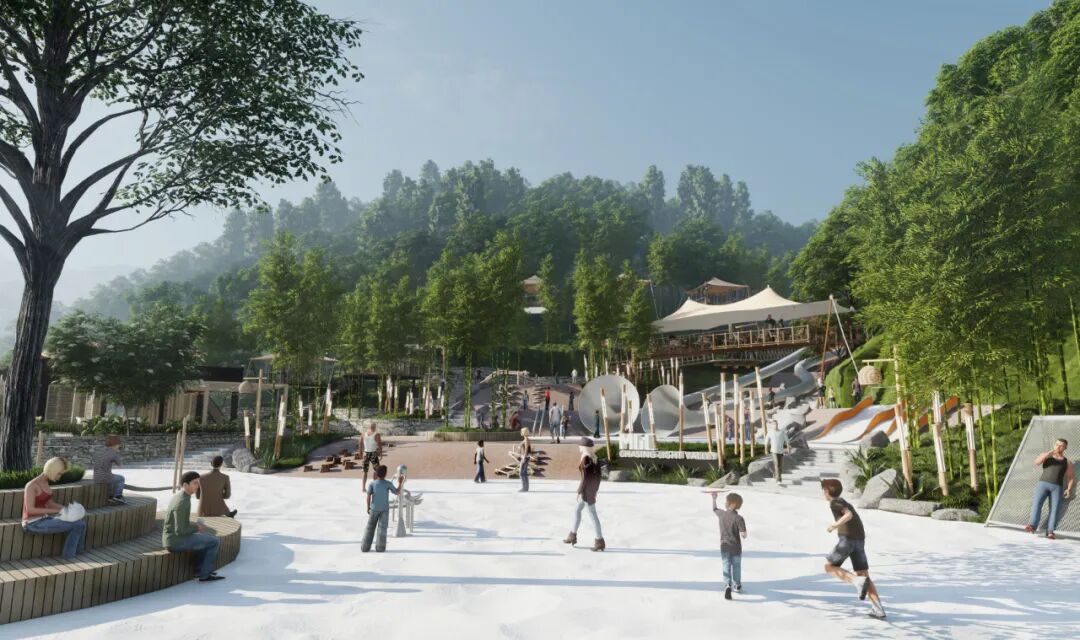 成片的竹林、自然的山体和静谧的湖面构成安吉M时光自然的基底,通过植入人工沙滩、无动力乐园和林间餐厅及咖啡厅,让湖畔波光、山谷清风和洋溢着孩童欢笑的竹林成为亲密与快乐氛围的媒介。大人们在林间喝茶聊天,孩子们在沙滩上玩耍,在山体无动力乐园嬉戏,在大自然中享受与自然的互动。做一天山谷的居民,快乐成为这里可以感染的荷尔蒙。
