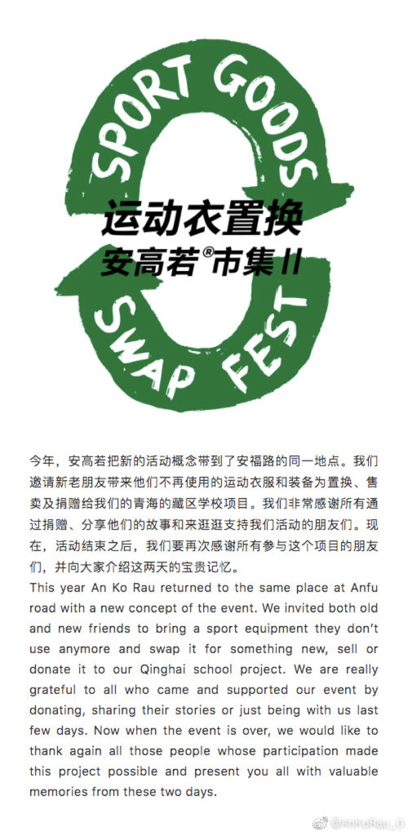 在线下运动市集中,An Ko Rau开设了”二手运动衣置换“专区,鼓励大家将闲置的运动衣物进行置换/直接售卖,或通过An Ko Rau 青海藏区学校项目捐赠给青海曲麻莱县的小学生们,“置换”这一概念也将在未来的市集中延续下去。