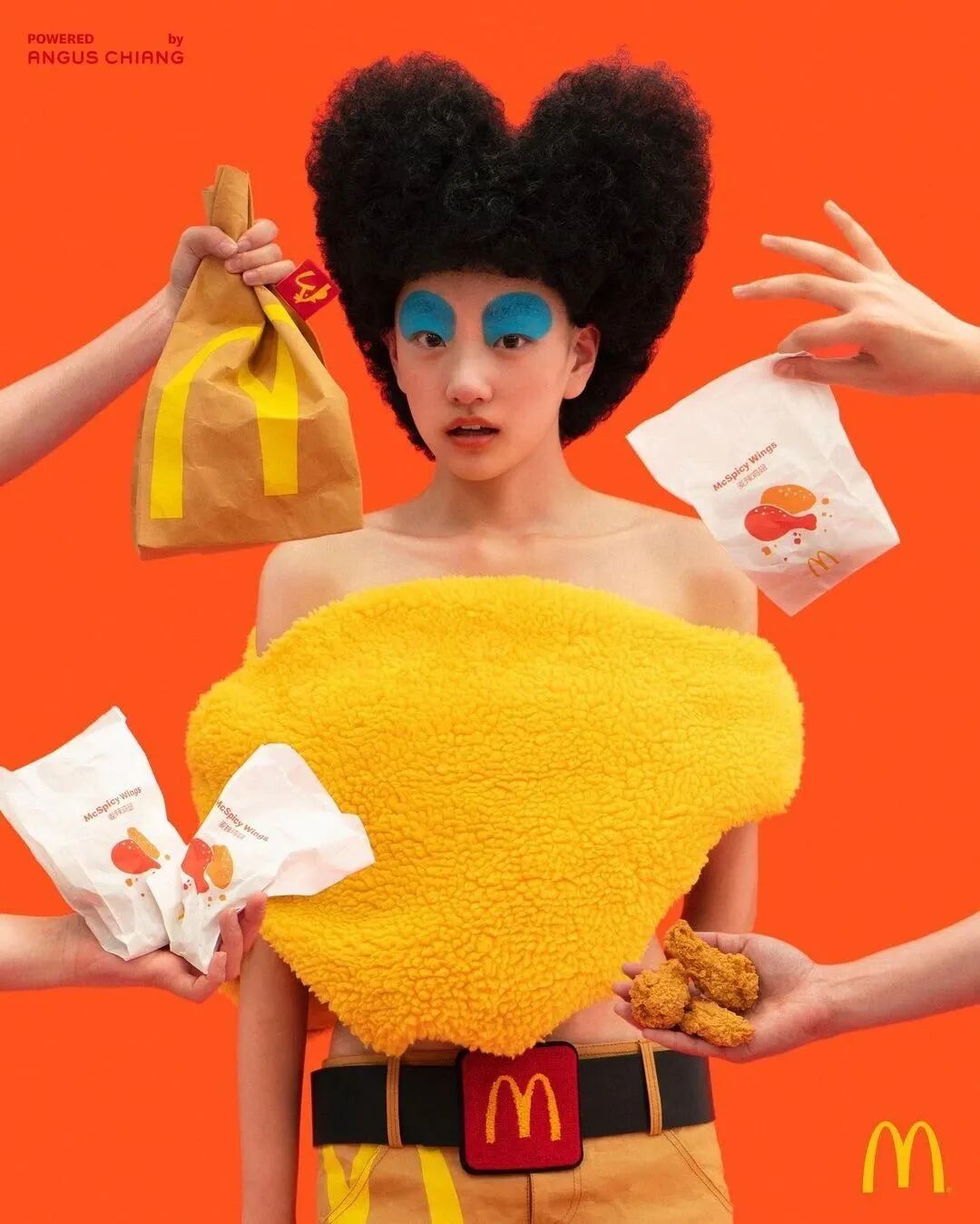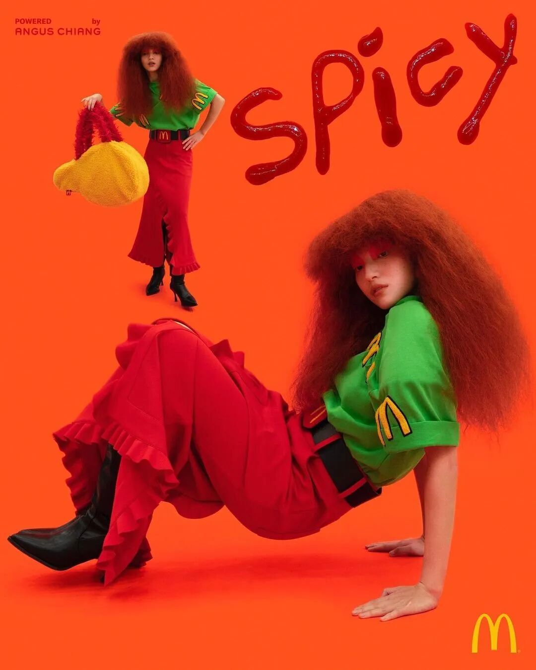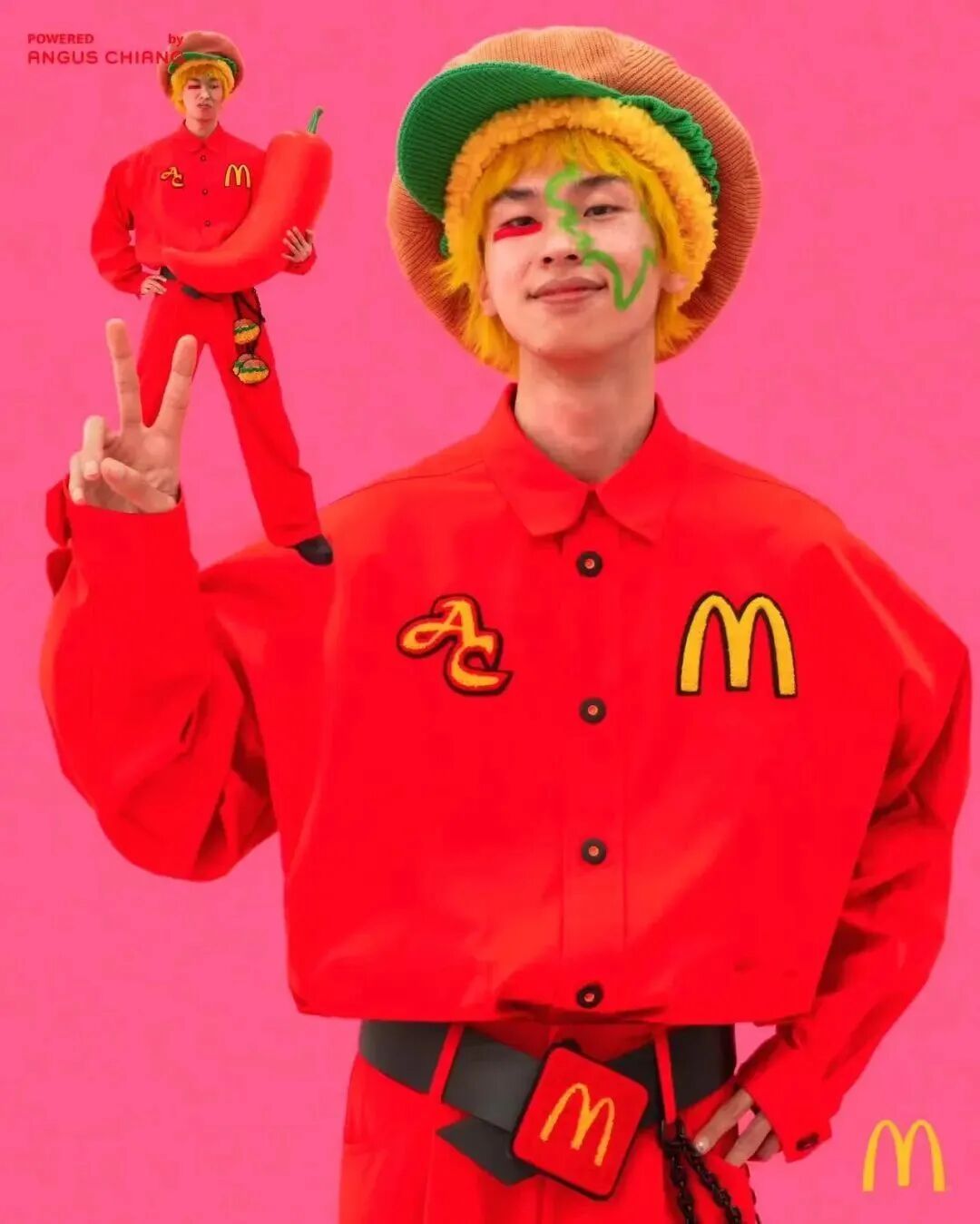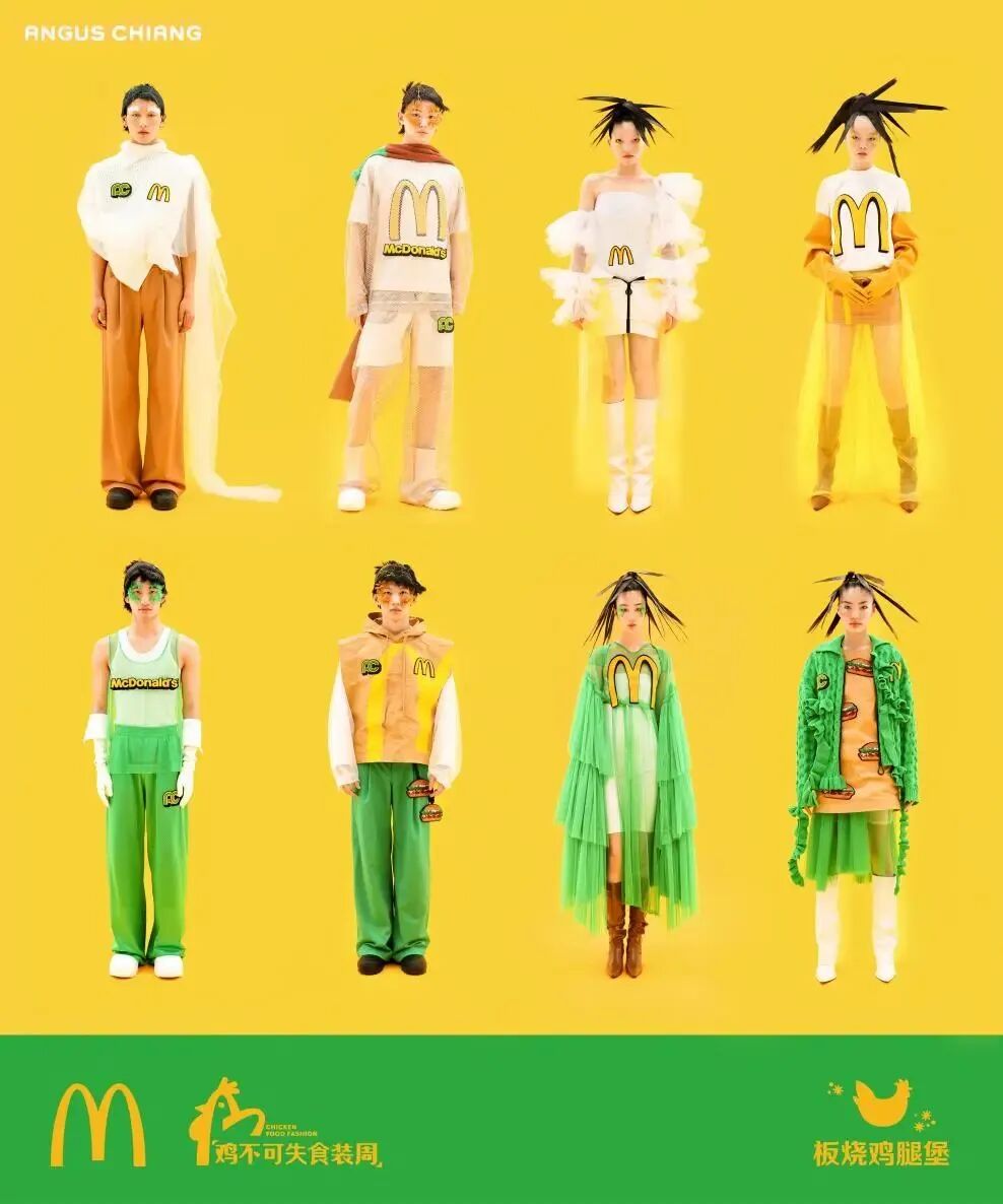 中国麦当劳邀请设计师江奕勳同名品牌ANGUS CHIANG为年末“鸡不可失食装周”打造系列时尚单品。作为麦当劳跨界食装周的重磅首场,首场“超鸡辣辣辣”大秀以麦当劳最为大众识别的红、黄色作为主色系,并以白、黑色做为点缀色搭配,系列融入了ANGUS CHIANG式的幽默趣味、色块色彩、街头风格,并沿用其过往经典款式翻玩再造。