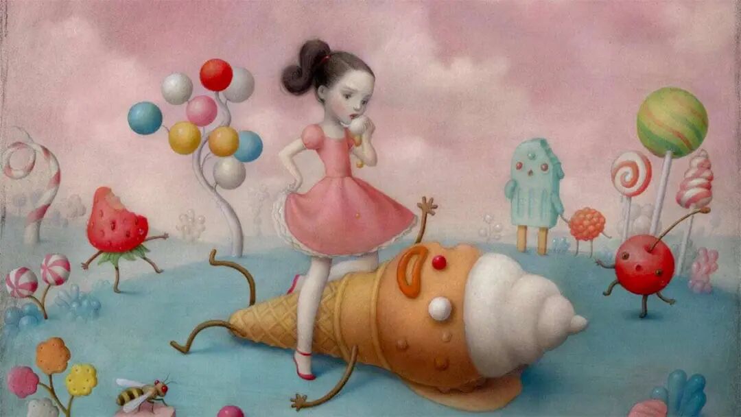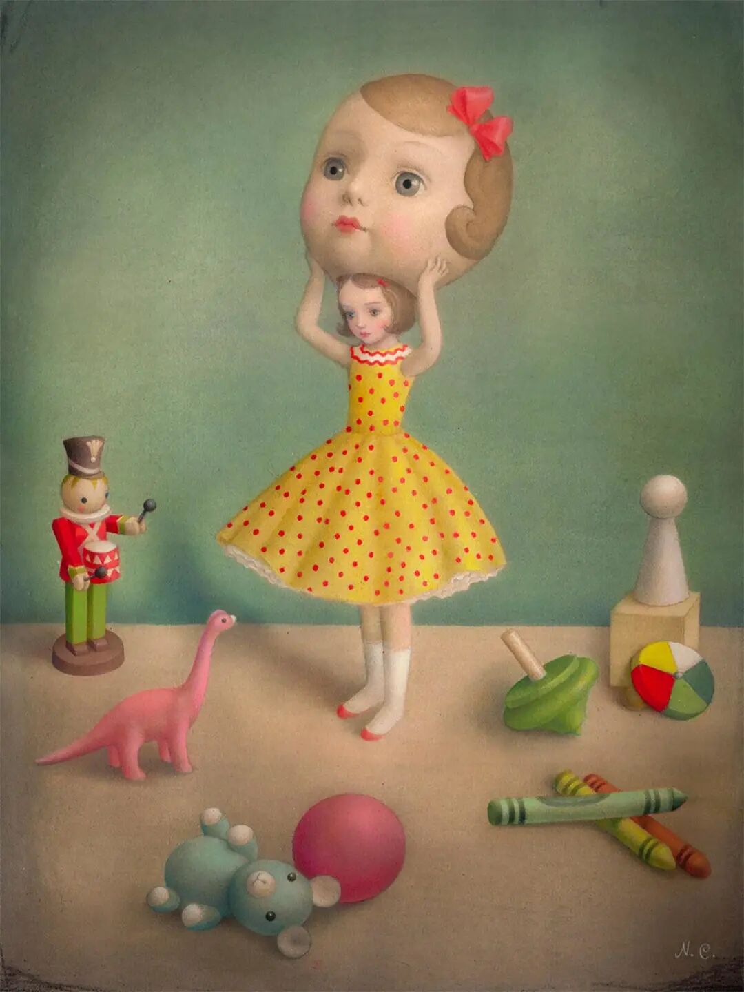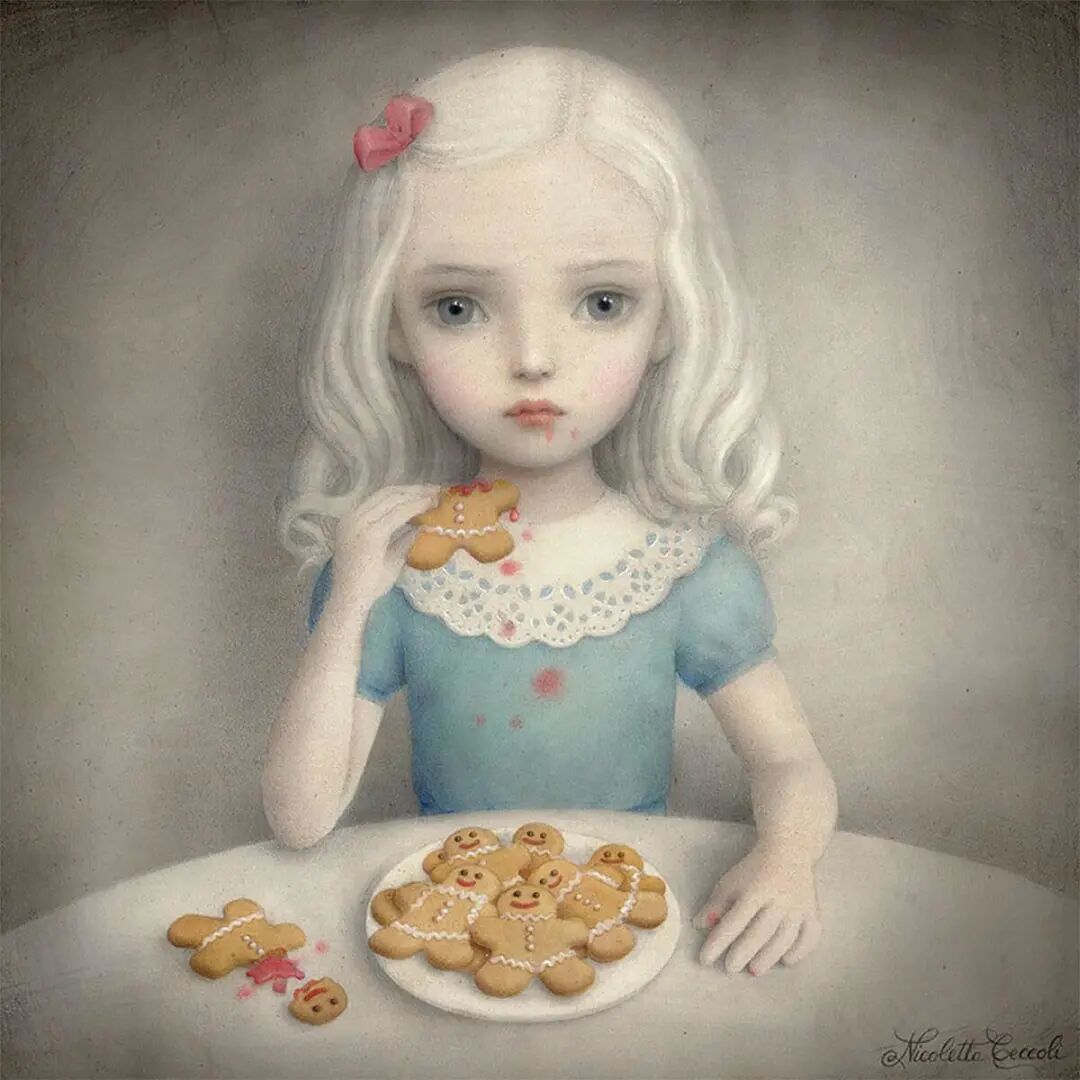 尼科莱塔·切科利的插图中的元素,都是小孩子喜欢和热爱的事物,比如洋娃娃、小动物、棒棒糖等等,但是组合在一起的画面和场景却让人感到非常不安,尤其是画中主要元素,一个穿裙子的小女孩,表情肃穆,流露出与这个年纪不相匹配的复杂情绪。