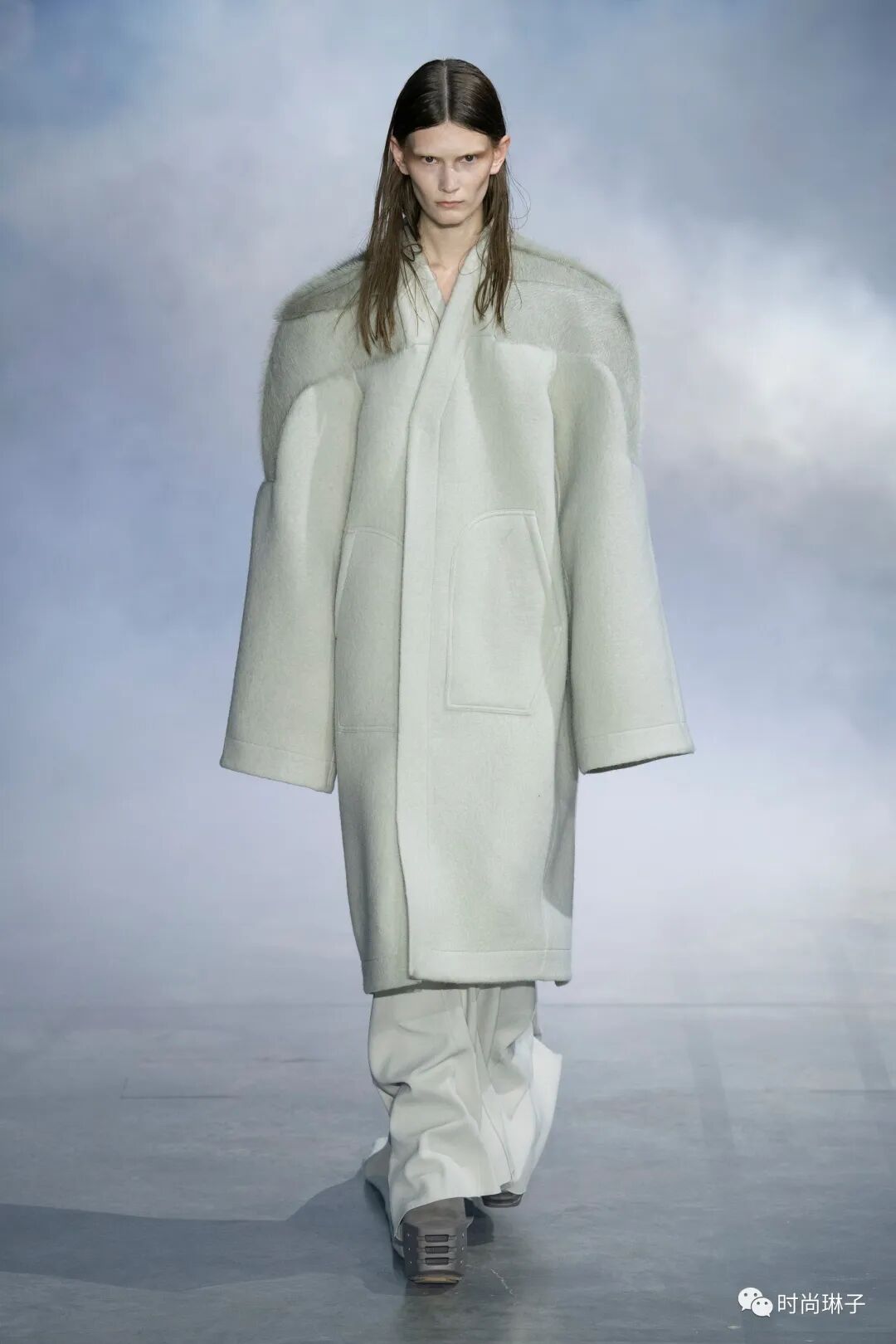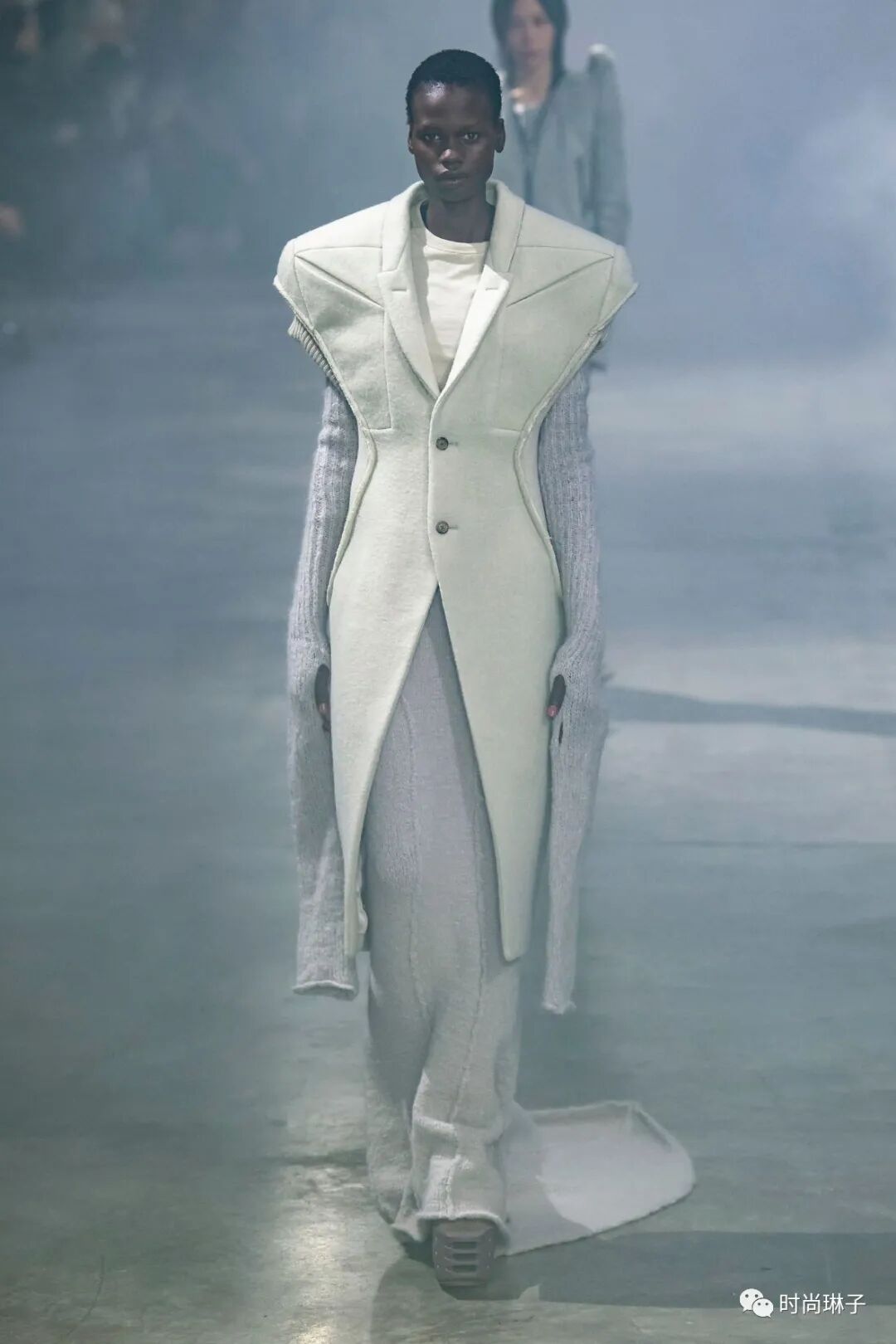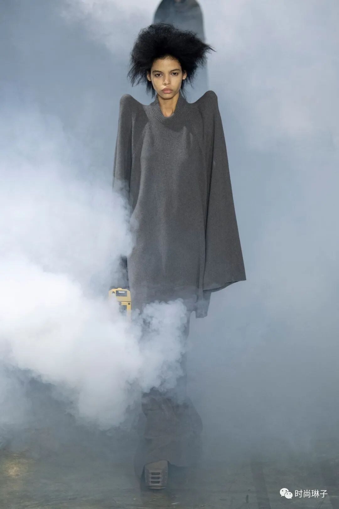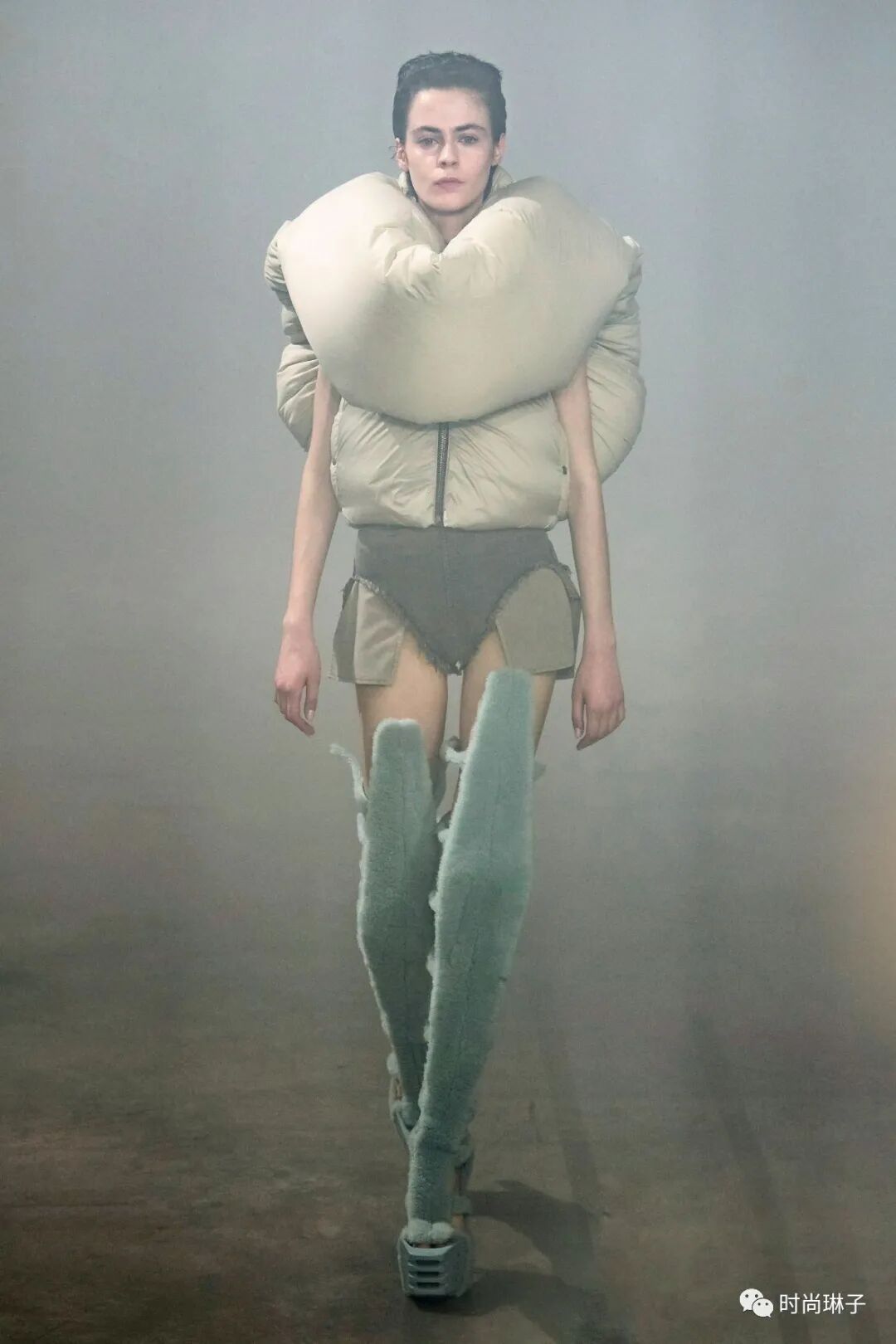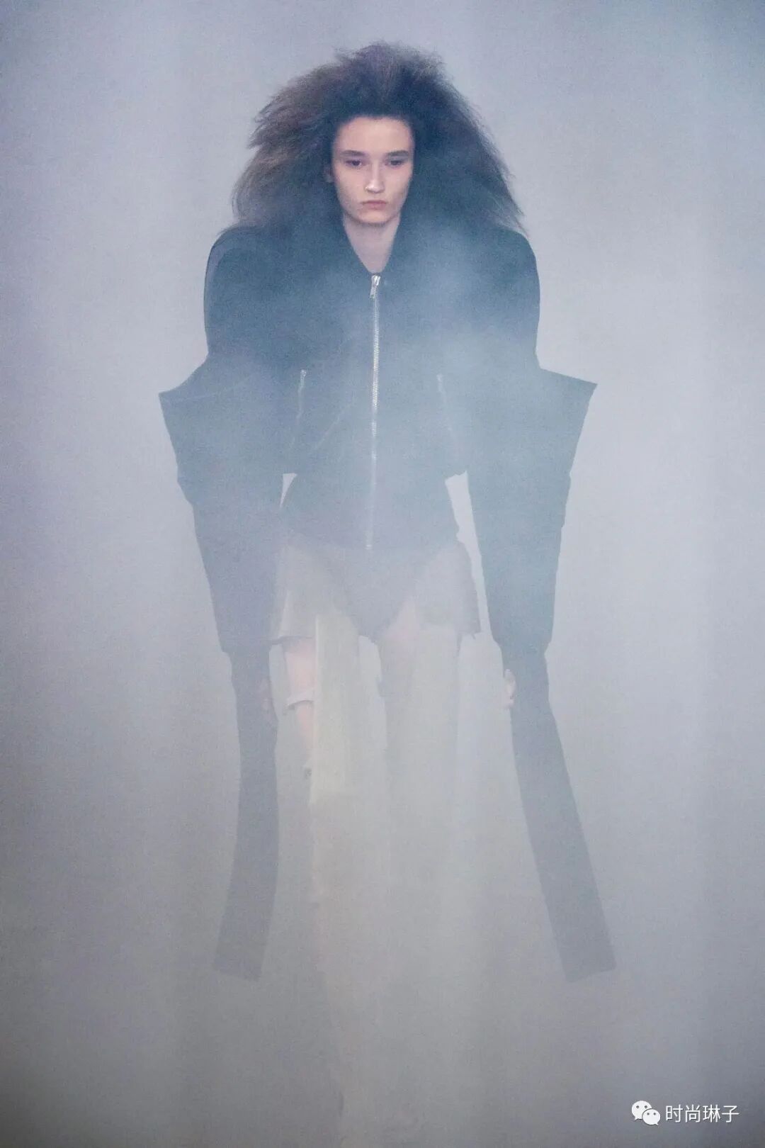 在世界局势不稳定的当下, Rick Owen 通过2022秋冬系列以及时装秀背景选曲《第五交响曲》传达了积极正面的能量,以及向死而生的美丽信仰。