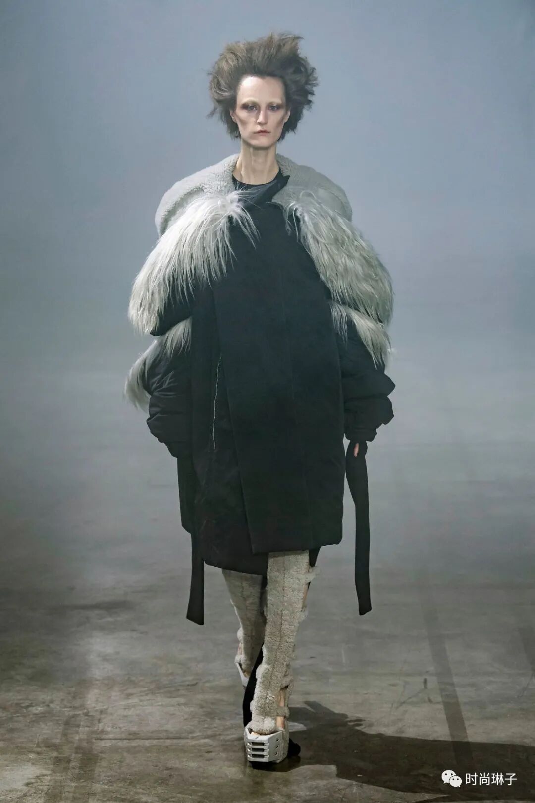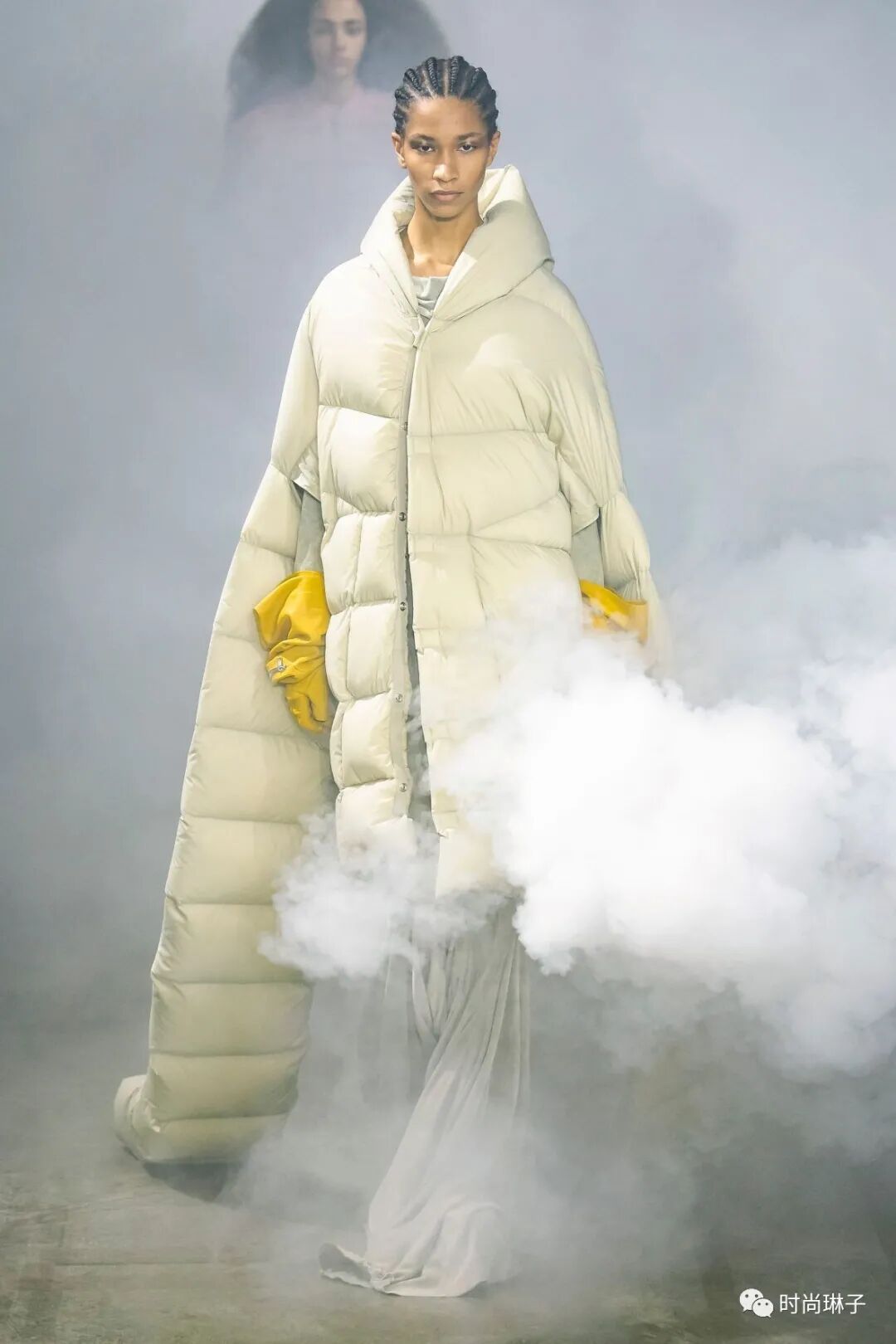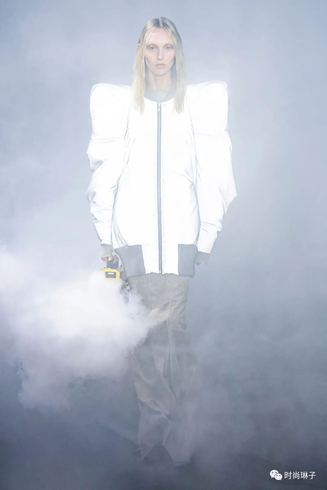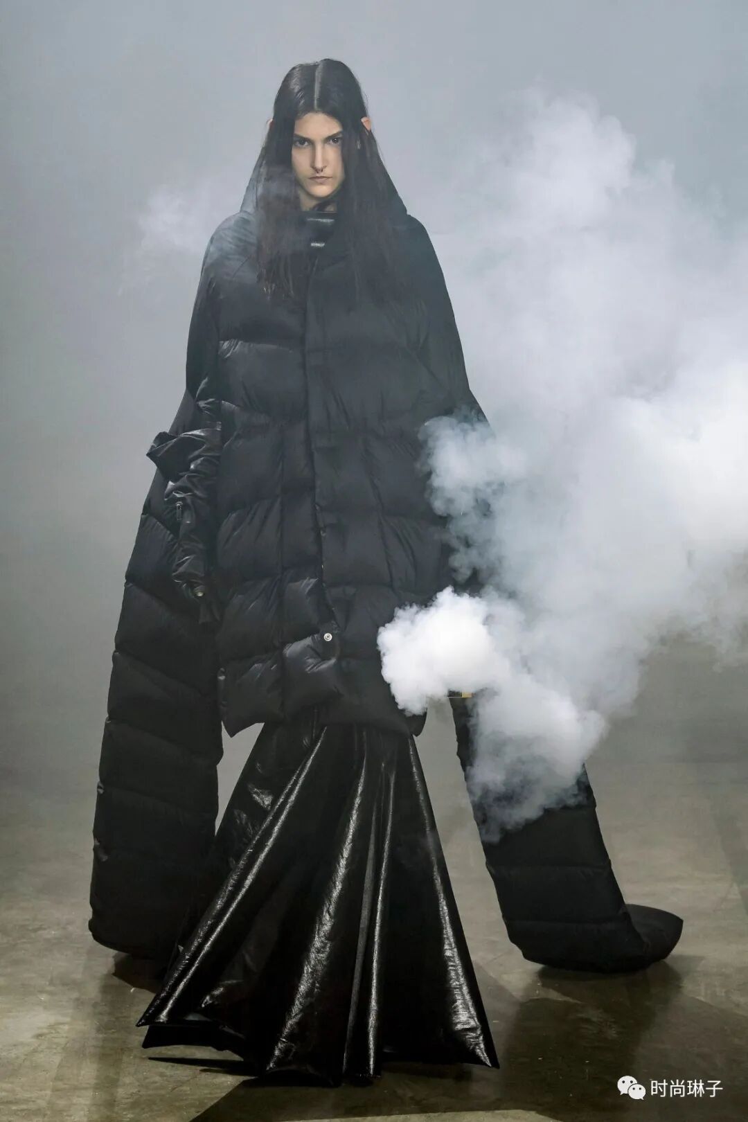 该季除了肩部设计极富个性的外套,还有袖长及地的羽绒夹克,皮草装饰的派克大衣,以及超长款的披风等等,模特在迷雾中行走,在探索中寻找人生的真谛。
