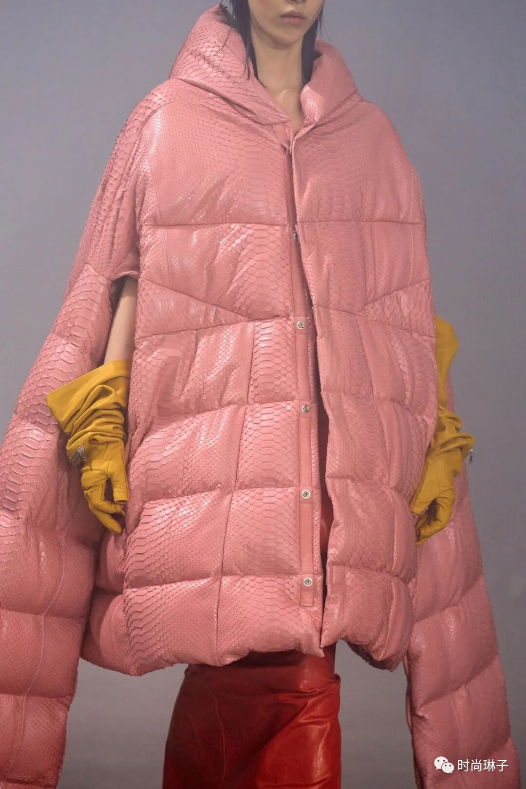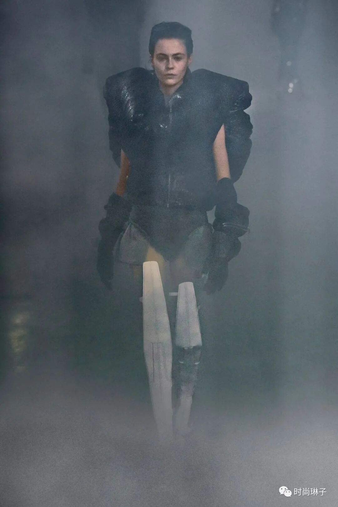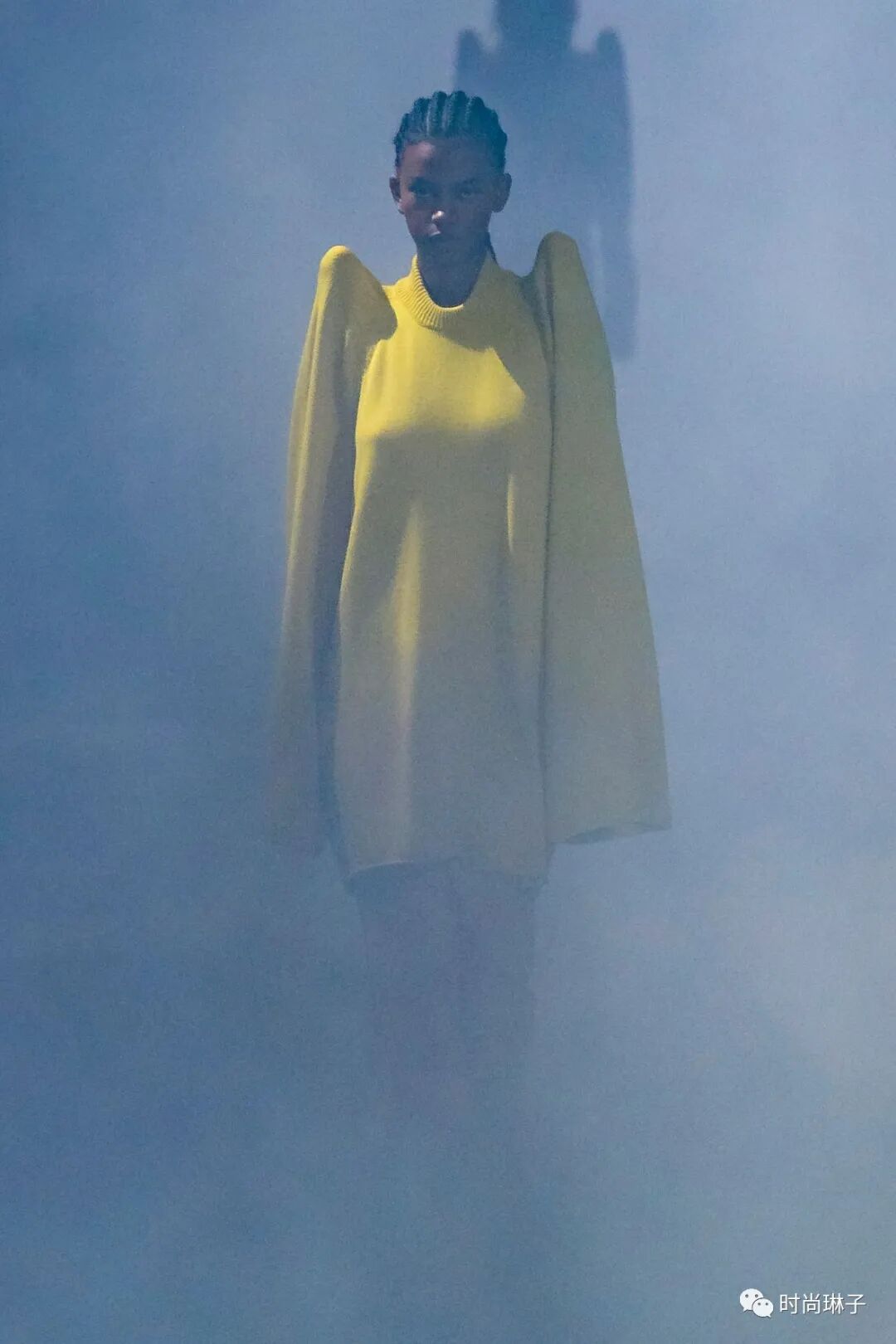 该季除了肩部设计极富个性的外套,还有袖长及地的羽绒夹克,皮草装饰的派克大衣,以及超长款的披风等等,模特在迷雾中行走,在探索中寻找人生的真谛。