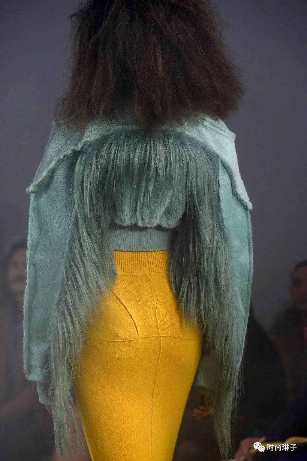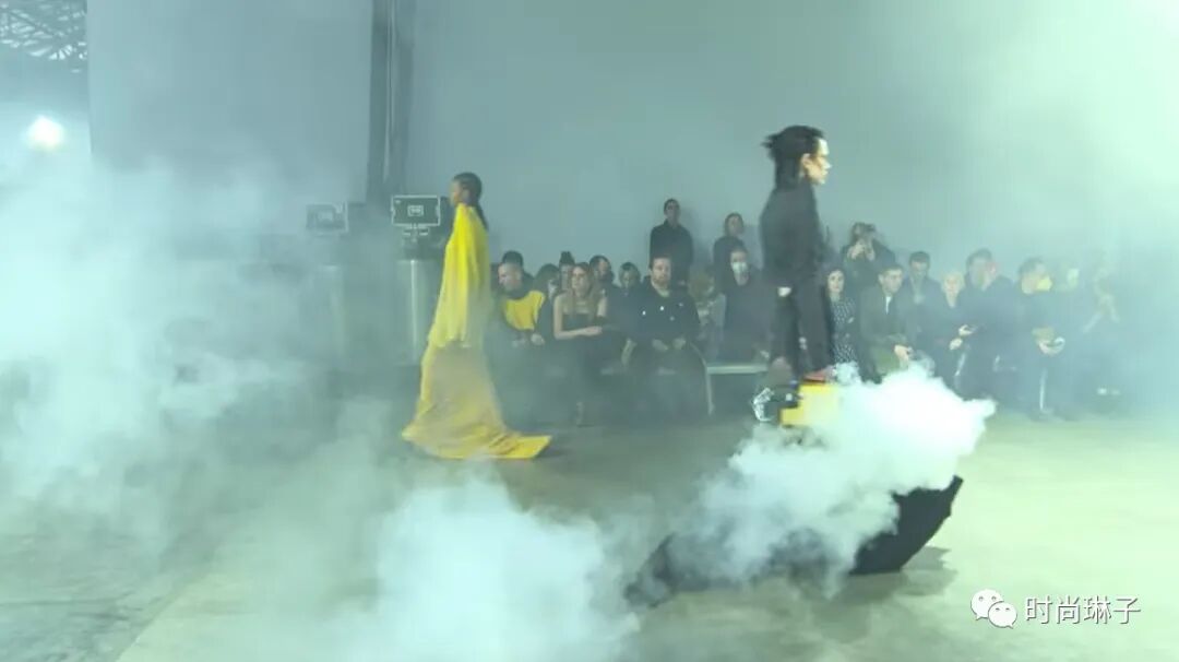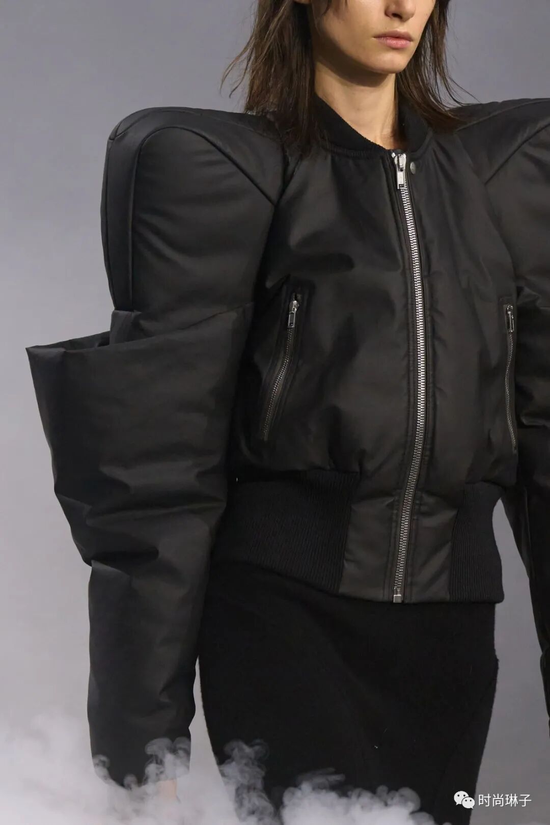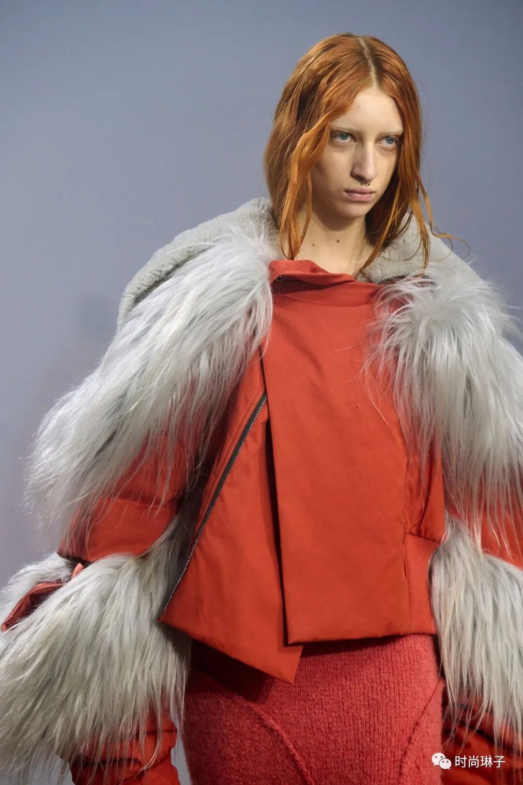 该季除了肩部设计极富个性的外套,还有袖长及地的羽绒夹克,皮草装饰的派克大衣,以及超长款的披风等等,模特在迷雾中行走,在探索中寻找人生的真谛。