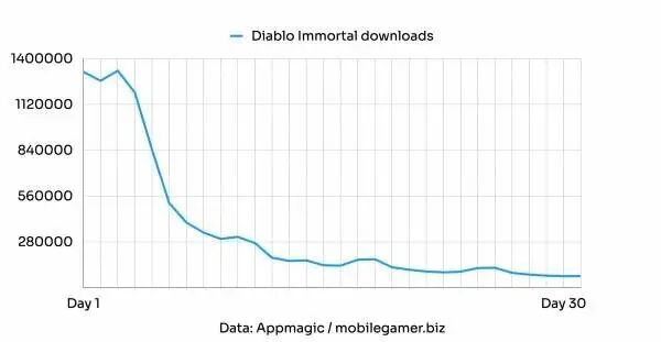 下载量方面,《暗黑破坏神:不朽》于上线当天达到峰值,吸引了大约132万次下载。这款手游首周下载量达到了685万次,首月下载量约为1035万次。