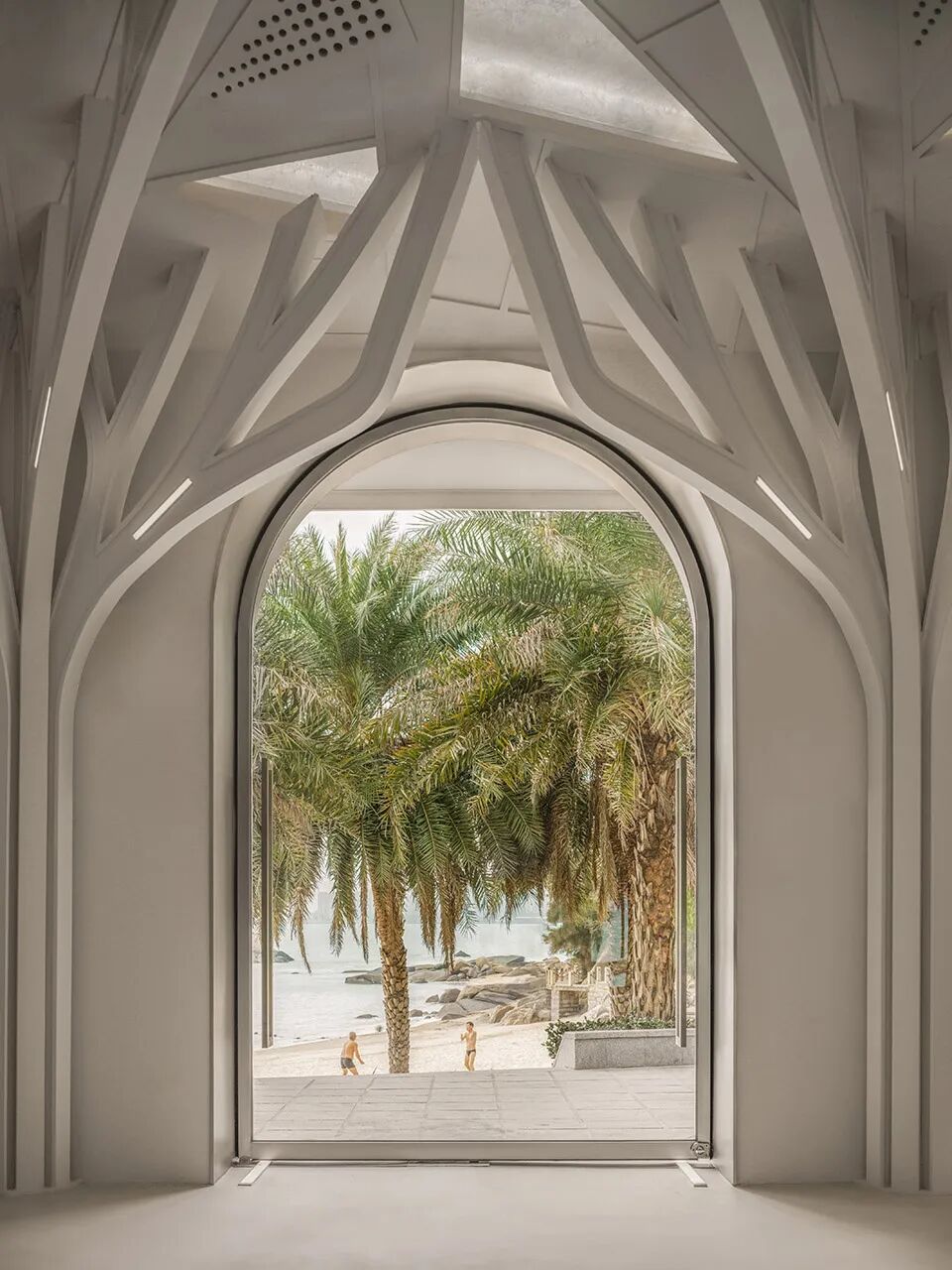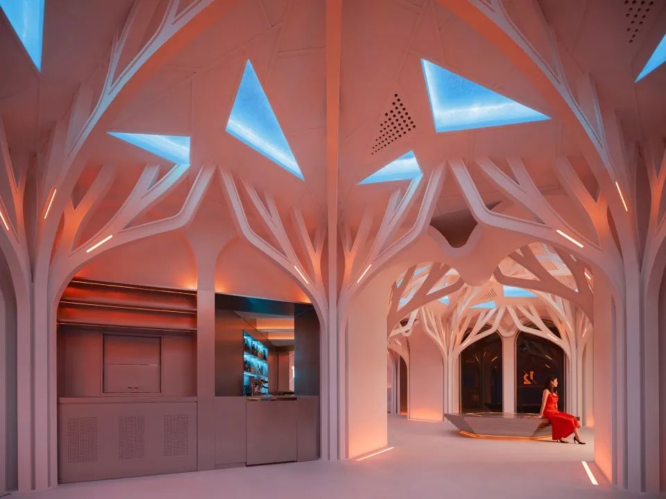 空间以自然为本底,有机地结合岛屿场地特色,并以多元复合的空间回应了品牌的野心,树冠上层层叠叠的叶,在“阳光”的照射下,形成影影绰绰的光投射在地面上。在二分之一咖啡生活,设计师在屋顶的“枝木”间隙中嵌入灯带,充满闲适悠然的趣味。
