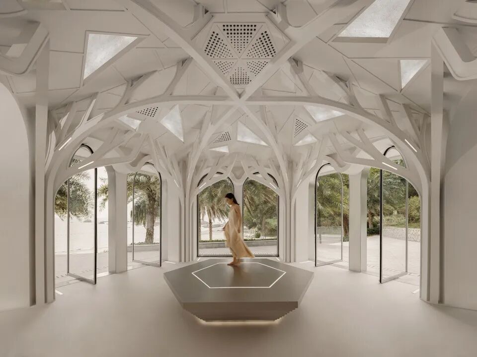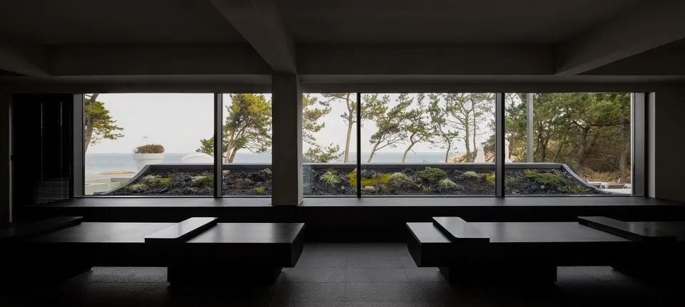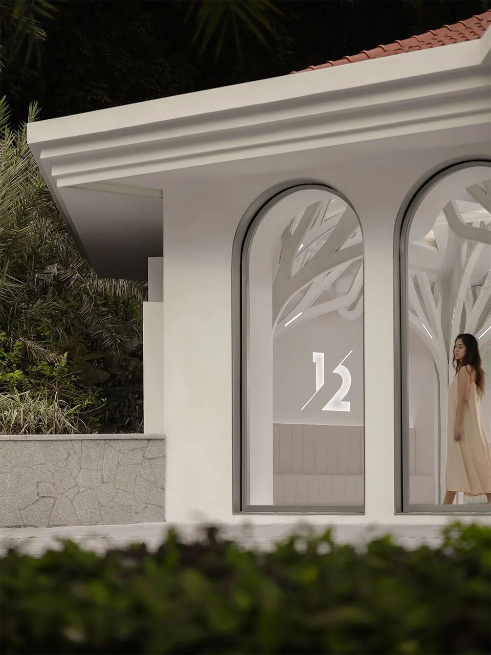 整个中庭设计成简洁现代的白色水池,客人从主入口进入,眼前一池平静的水面,让人瞬间摆脱城市生活的喧嚣繁杂,一下子进入宁静安逸的空间氛围。水池周围是一圈围合的落地玻璃,将自然光线最大化地引入室内, 空间整体的通透性也在视觉上带来一种流动感。