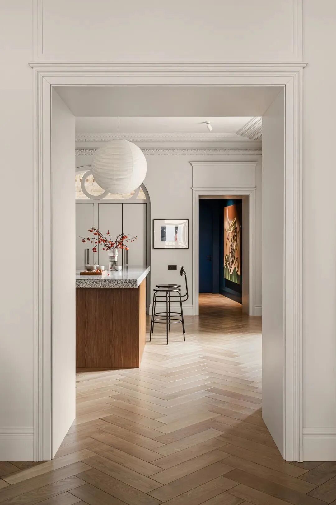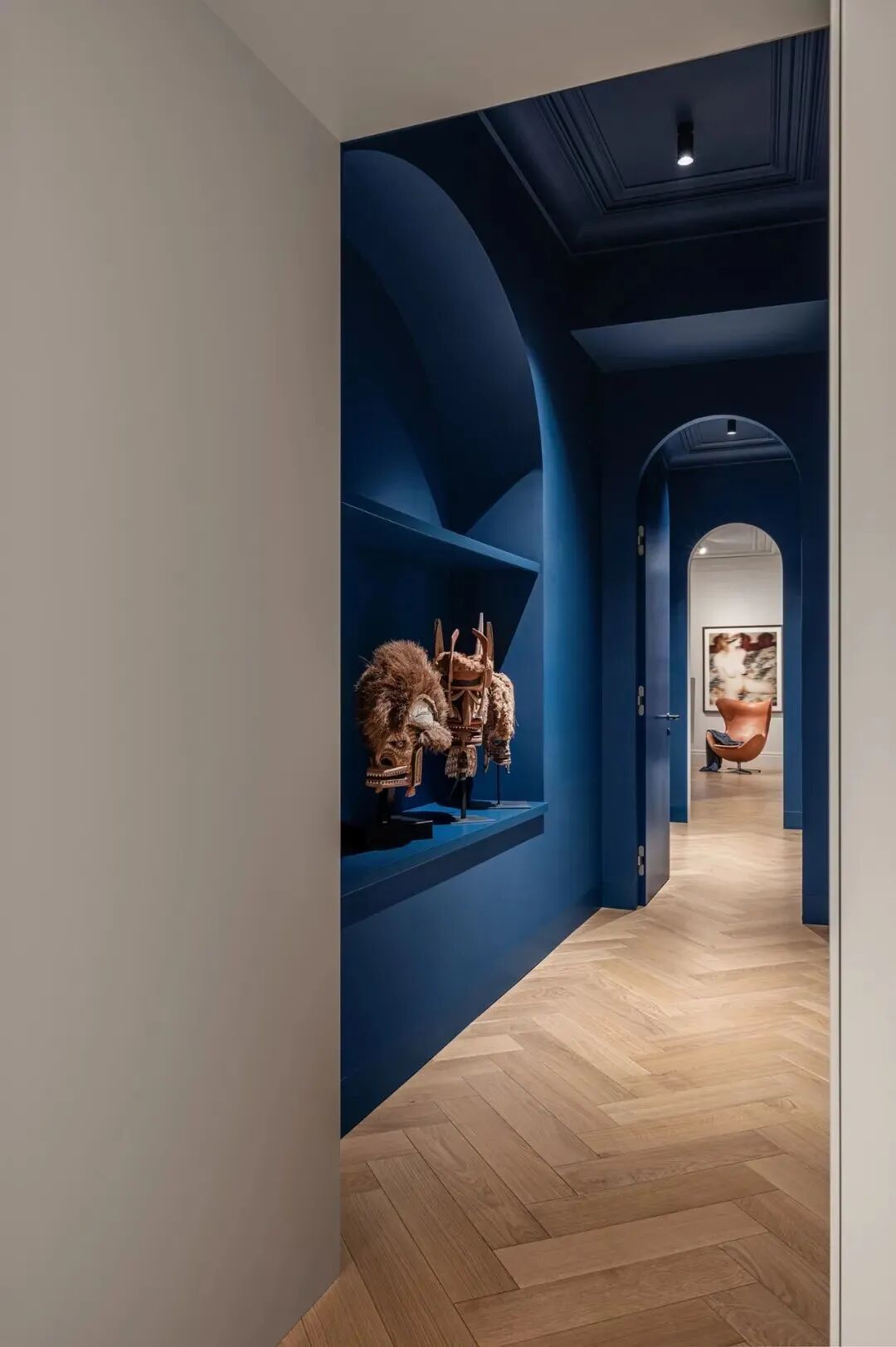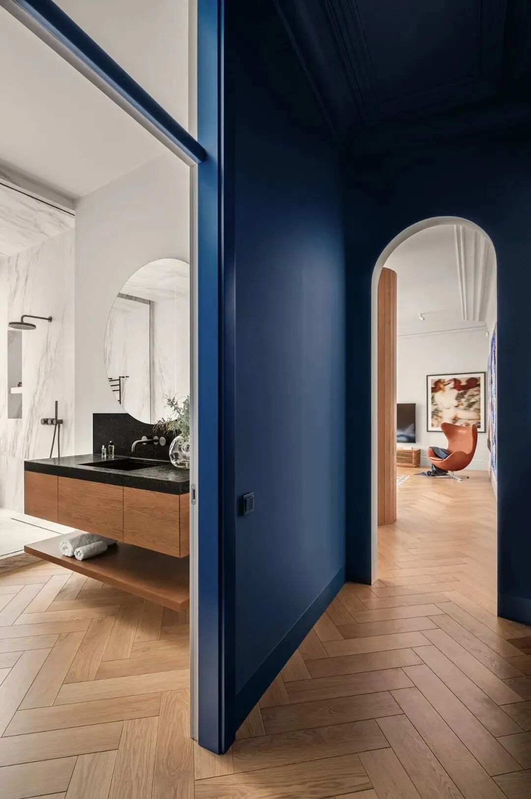 厨房连接公共区域和私人区域, 重新梳理这部分的空间格局之后, 可以直接从厨房进入办公空间, 强化空间之间的连接, 门上的拱形玻璃图案起到装饰作用, 烘托了艺术效果。 跳跃的克莱因蓝染色的廊道连接两个区域, 给了空间明确的界限划分, 也更加丰富了空间色彩, 成为具有独特的艺术性存在。 卧室里波西米亚风格的地毯, 带来异域风情,深褐色的扶手椅静坐一隅, 宁静又不失艺术感, 浴室的大理石装饰面诠释轻奢与素雅, 大面积窗户保障通风与清新的同时, 将窗外的景色吸纳,注入灵动与生机。