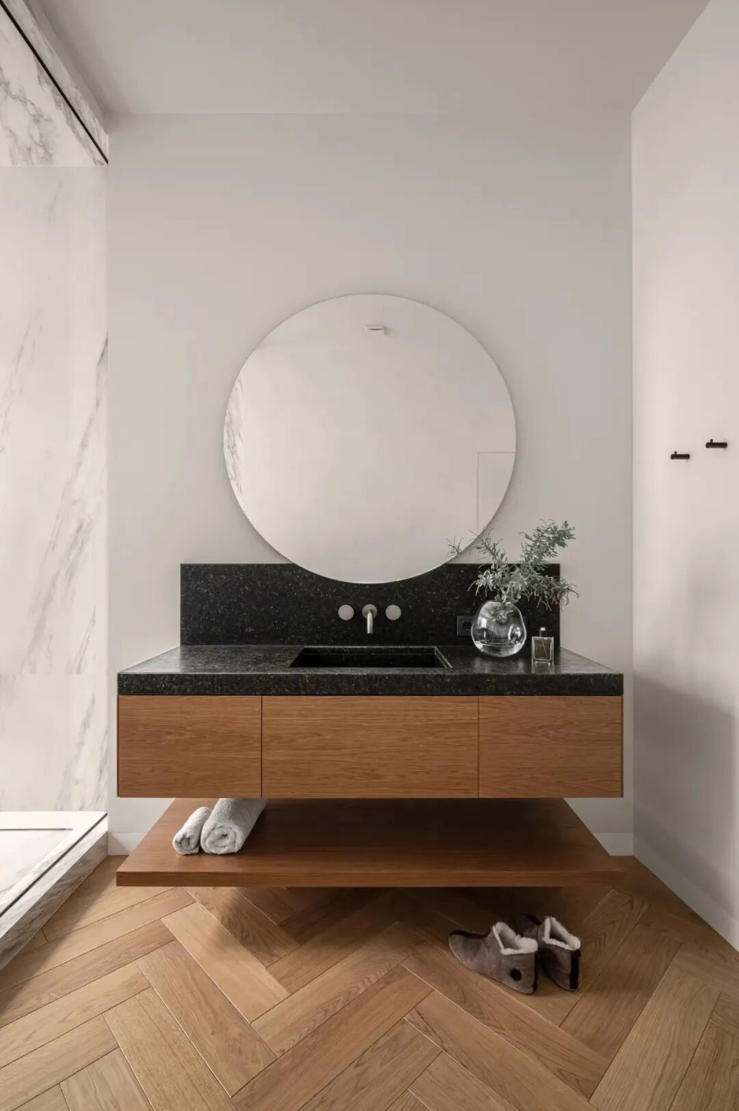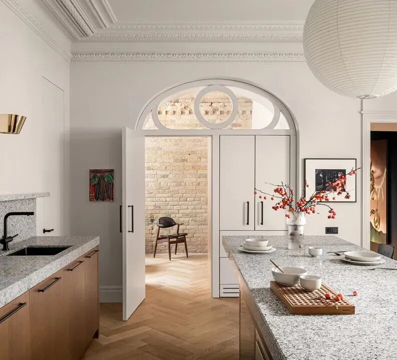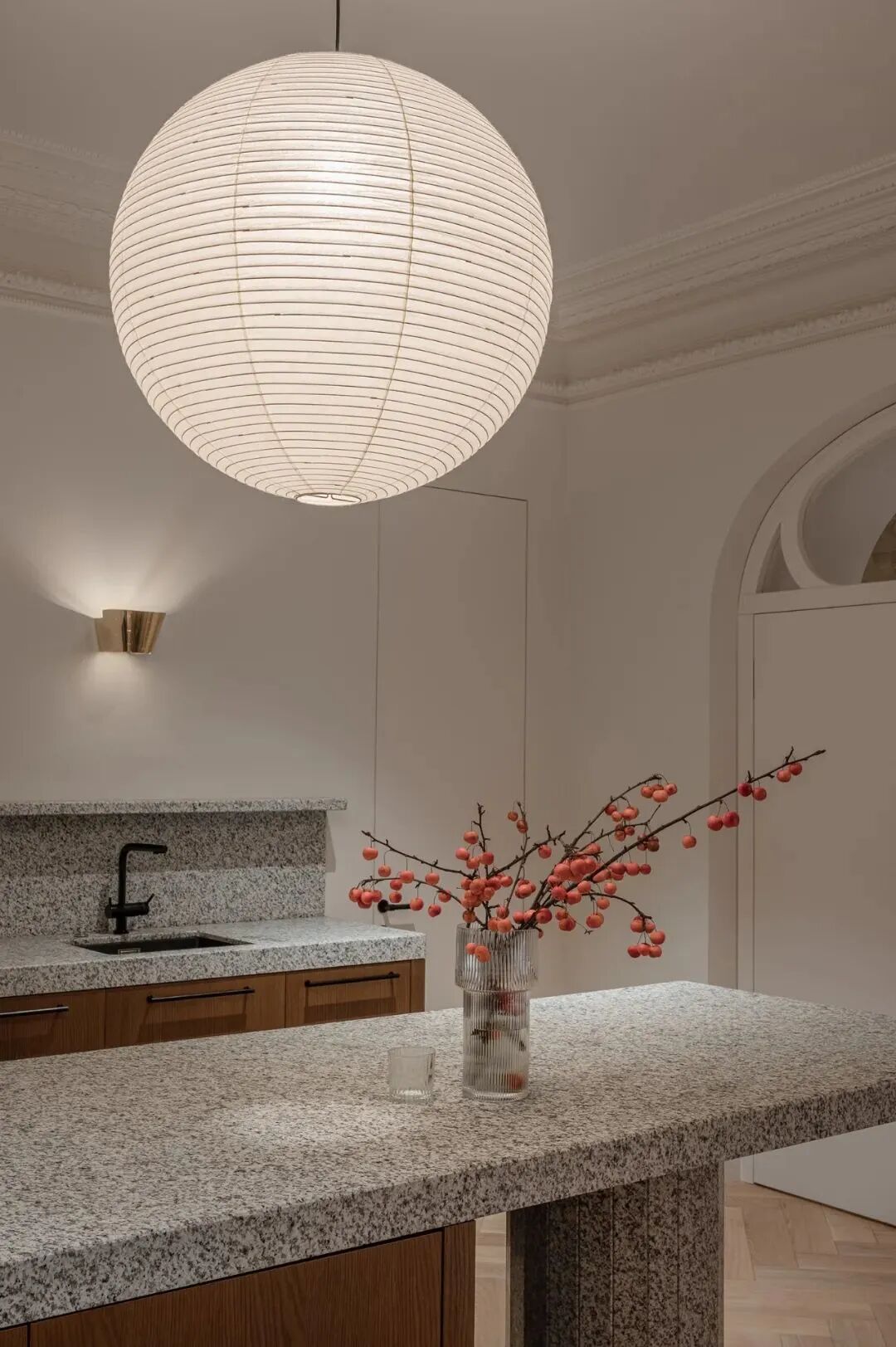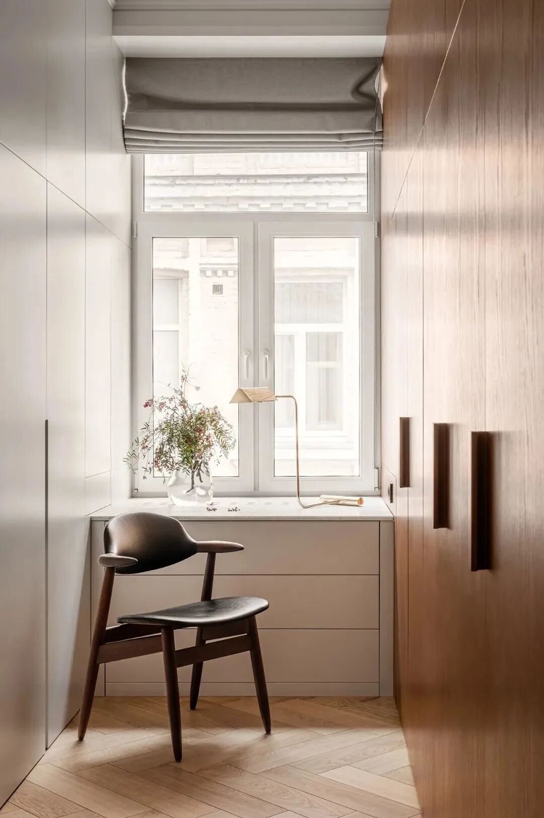 厨房连接公共区域和私人区域, 重新梳理这部分的空间格局之后, 可以直接从厨房进入办公空间, 强化空间之间的连接, 门上的拱形玻璃图案起到装饰作用, 烘托了艺术效果。 跳跃的克莱因蓝染色的廊道连接两个区域, 给了空间明确的界限划分, 也更加丰富了空间色彩, 成为具有独特的艺术性存在。 卧室里波西米亚风格的地毯, 带来异域风情,深褐色的扶手椅静坐一隅, 宁静又不失艺术感, 浴室的大理石装饰面诠释轻奢与素雅, 大面积窗户保障通风与清新的同时, 将窗外的景色吸纳,注入灵动与生机。