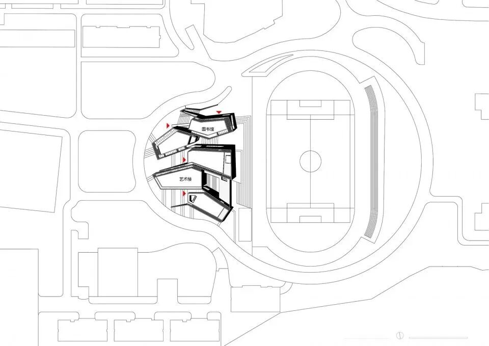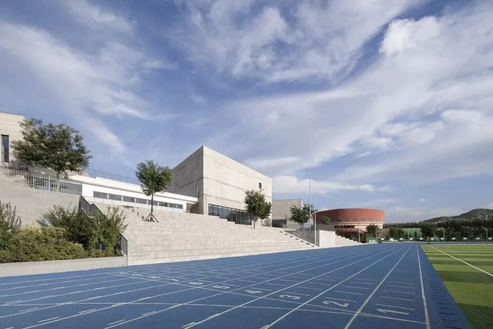 建筑室内外相互交融,为师生提供多样的交流空间,东侧结合体育场地成为看台或者午后阴影下的体育活动场所;西侧面对宿舍区分别形成图书馆及艺术楼的入口广场。
