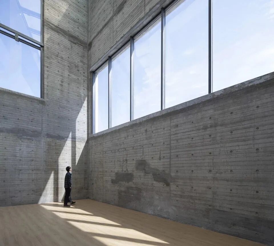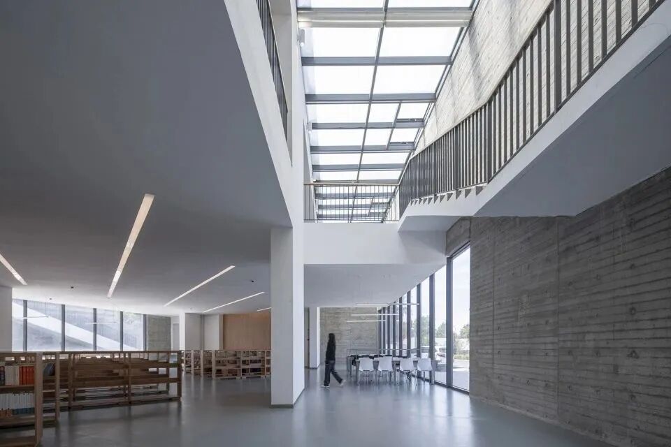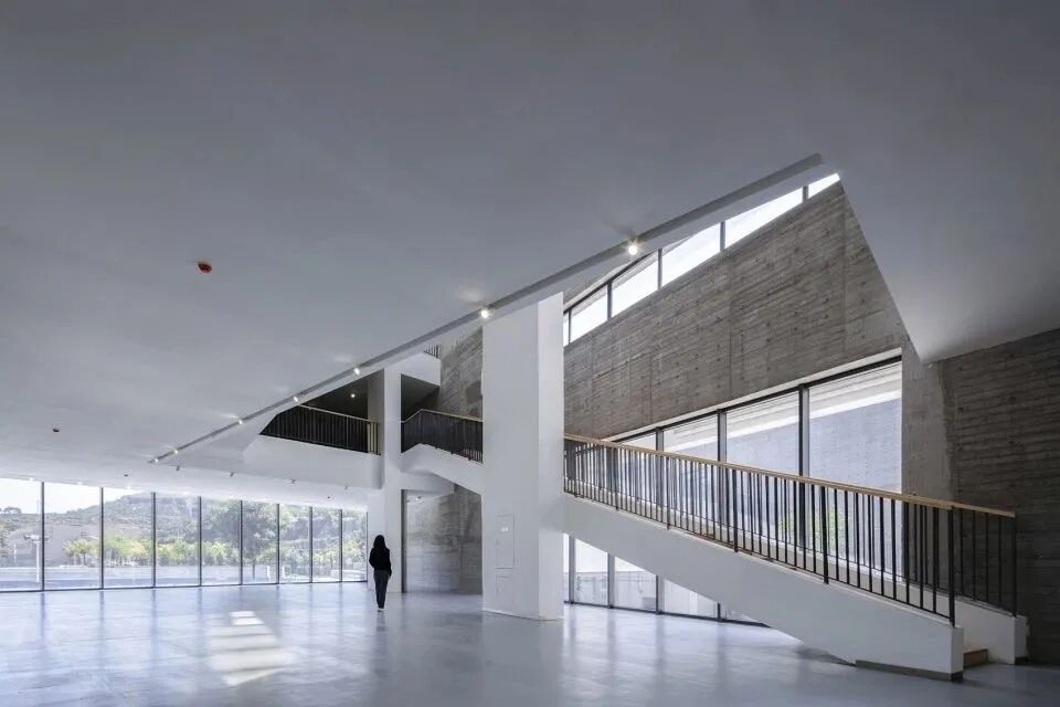 天窗顺应混凝土折墙开设,为室内提供静谧的阅览空间及光线稳定的作品展示空间,同时可减少墙体开窗面积,较好地适应当地严寒的气候特点。高低错落、粗粝木纹质感的混凝土折墙,与周边雄伟的山脉取得协调。