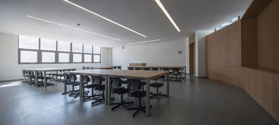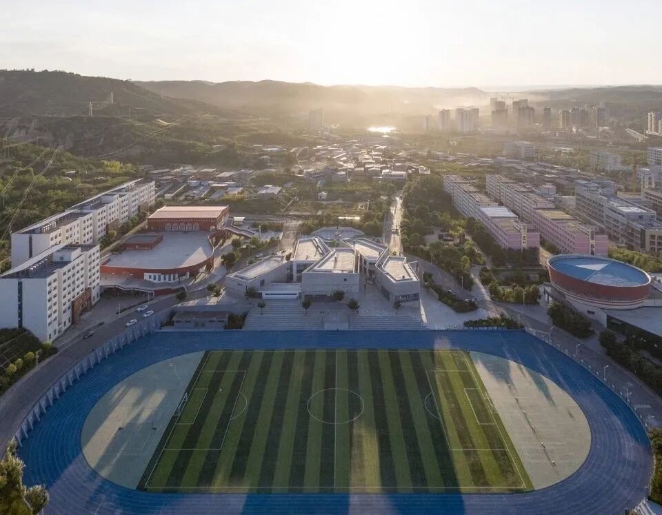 项目位于离山西兴县120师学校大约一公里的友兰中学内,场地南北高差约6米,立于教学区与生活区之间的校园中轴线上,包含图书馆及专业课室。