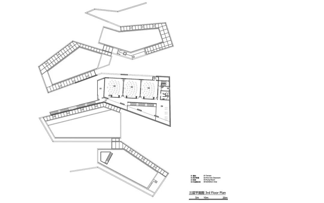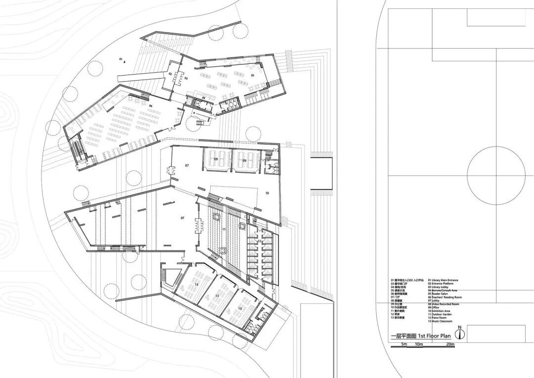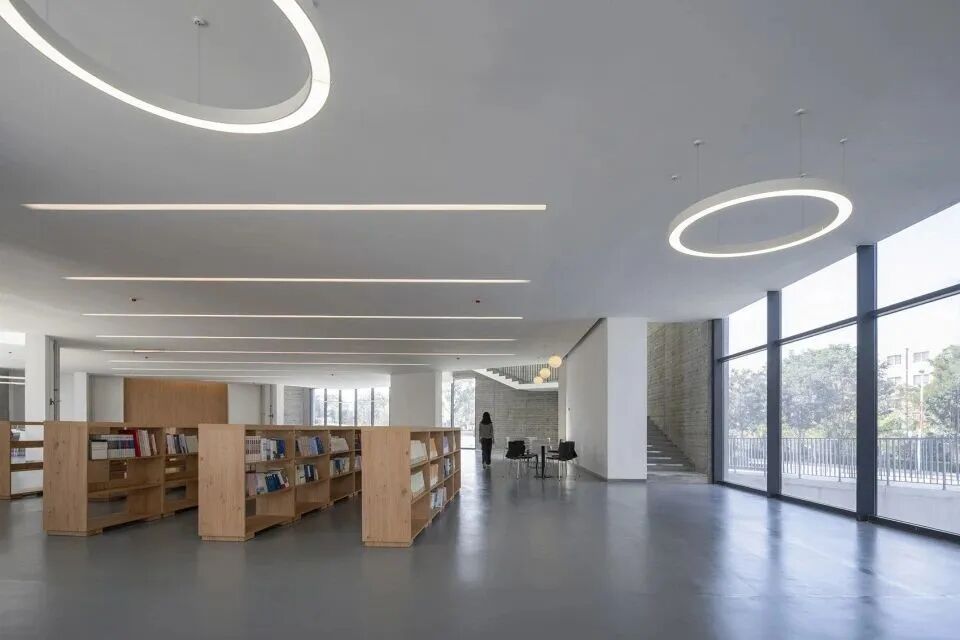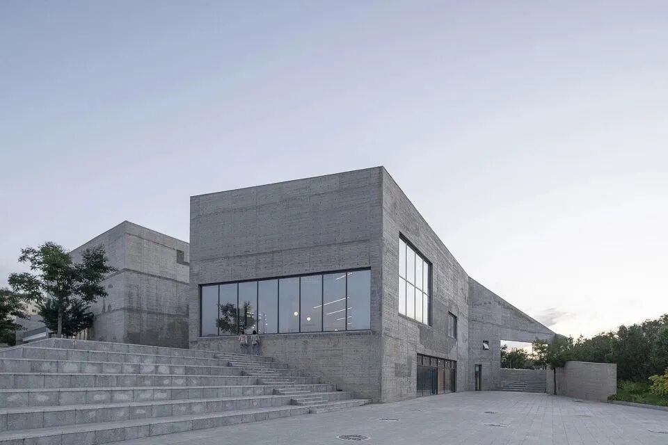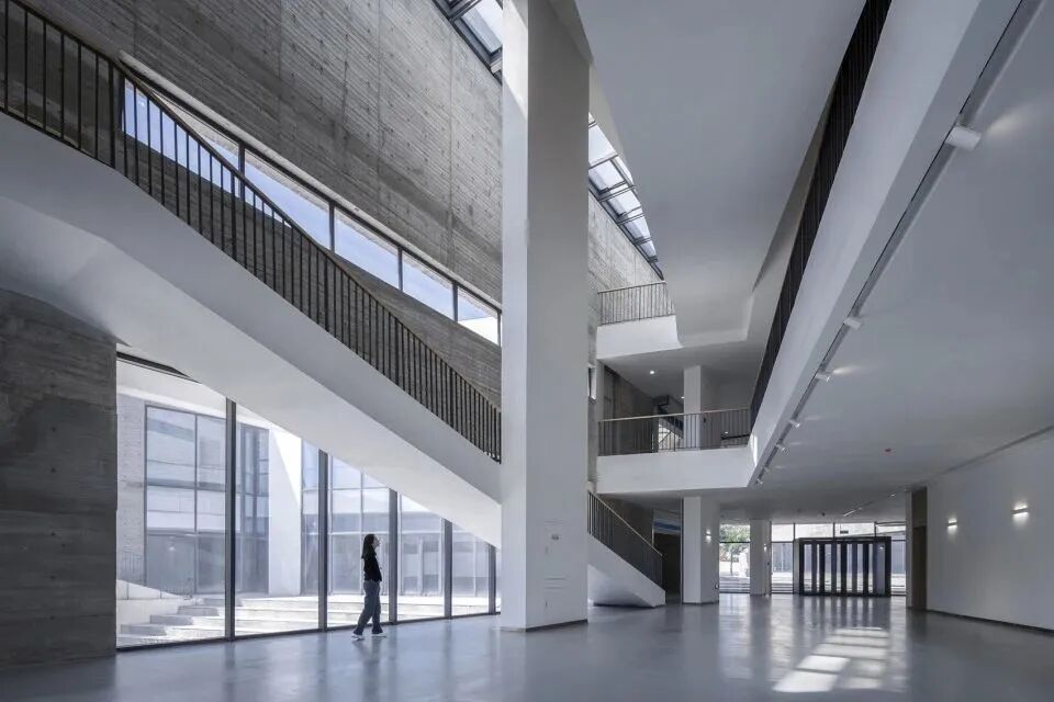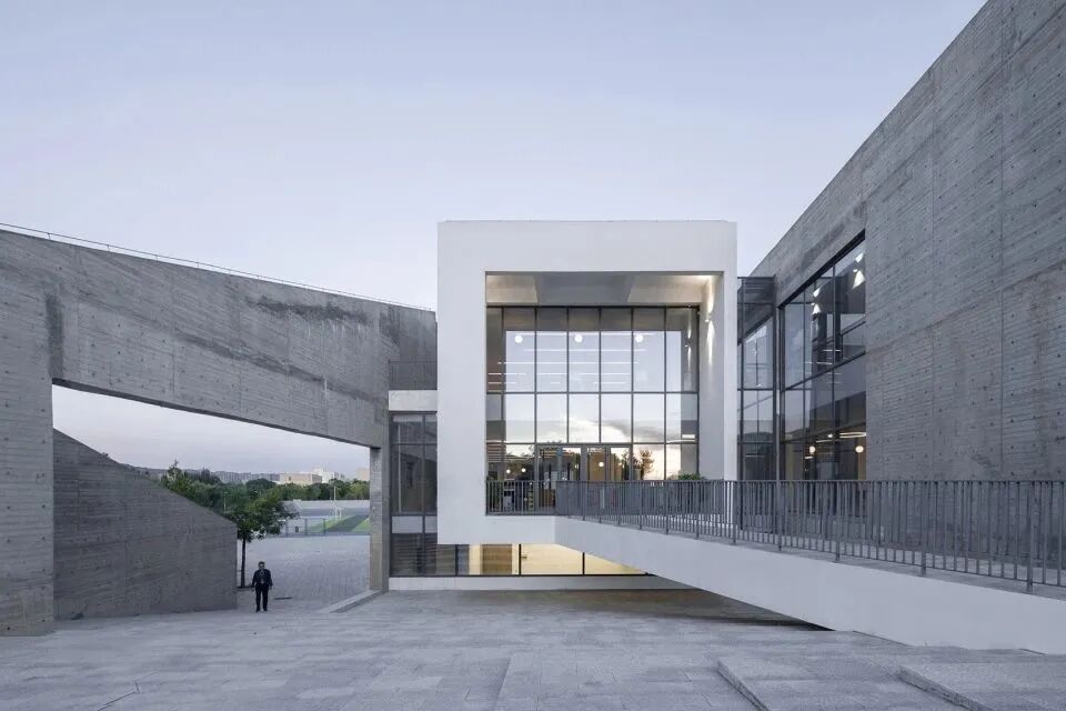 建筑师将折叠的墙体依地势顺延,图书馆、美术、音乐地理等专业课室及展厅分别置于墙体之间,形成一个建筑与庭院相间的布局形式。