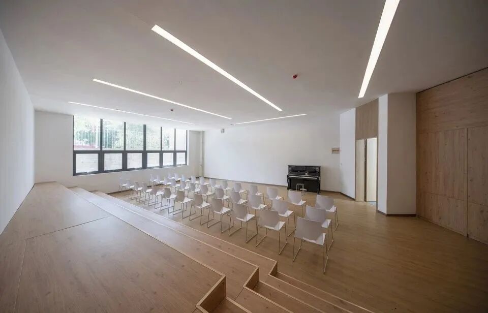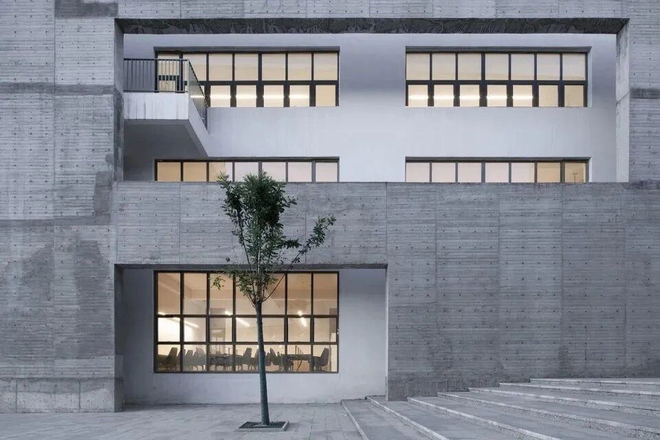连续的折墙使用粗糙混凝土与围合其中的白色建筑体块进行区分,创造内与外的围合特征,建筑立面效果丰富且有层次。窗外栽种树木形成对景,使建筑内部具有良好的景观视线。