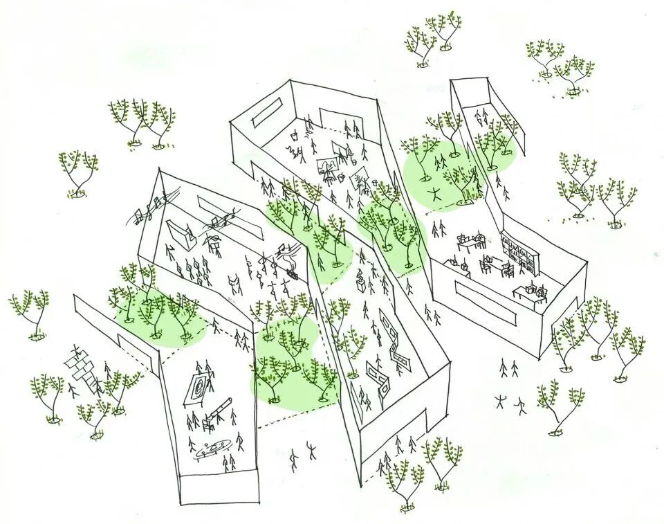 建筑师希望建筑形成一个村落意象,意在营造多层次的游走空间体验及一个可穿越的多孔性场所,与原有刻板的教学楼形成对比。