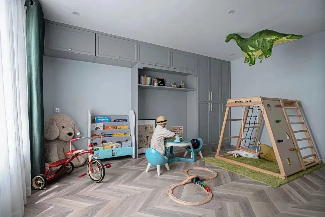 ▲ 活动室以浅色调为主,适应宝宝的眼睛,靠墙打造开放置物板+储物柜设计,原木式攀爬游乐设施等,给宝宝做启蒙教育和爬行锻炼。