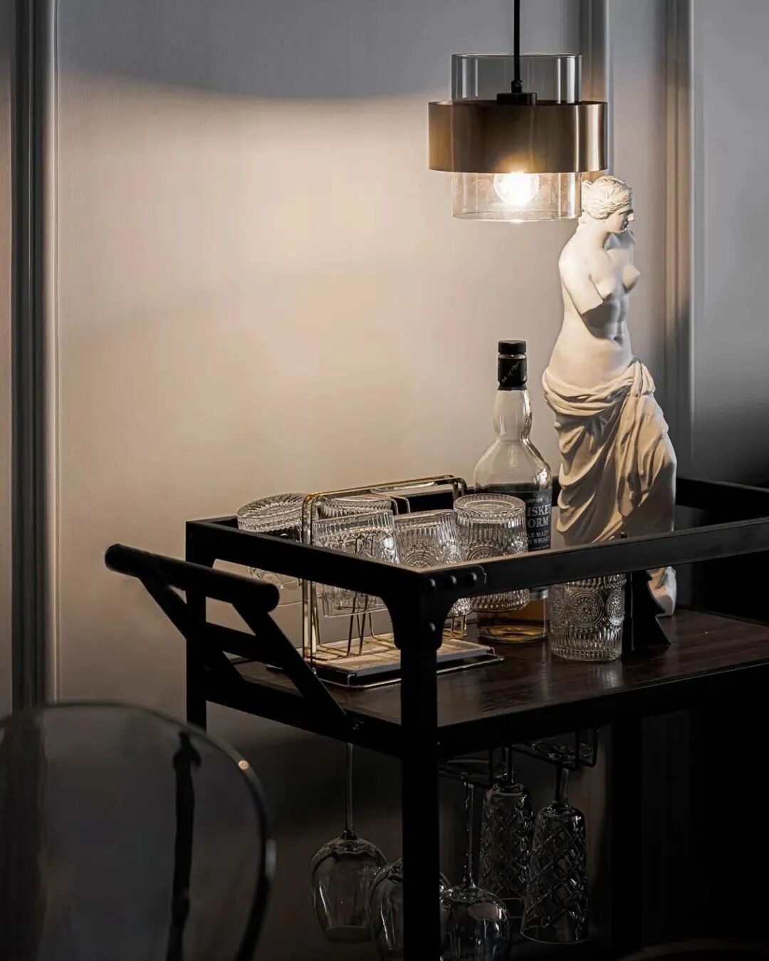 ▲ 沙发一旁置以小餐车,金属吊灯点缀,维纳斯雕塑摆件彰显艺术美,精致的酒品杯具收纳于内,灯光渲染下,极富生活情调。