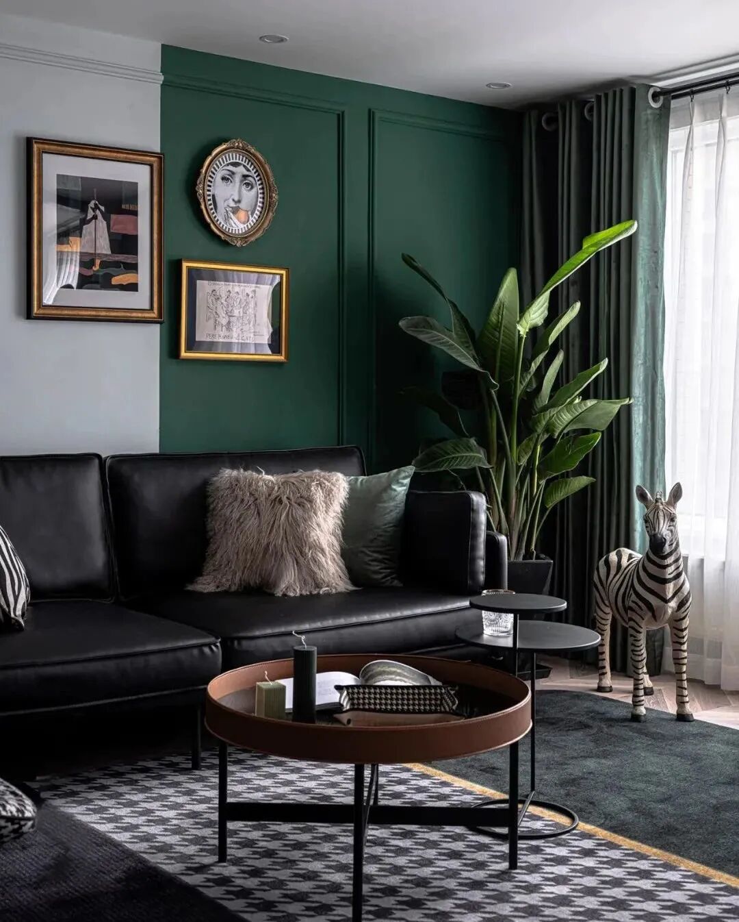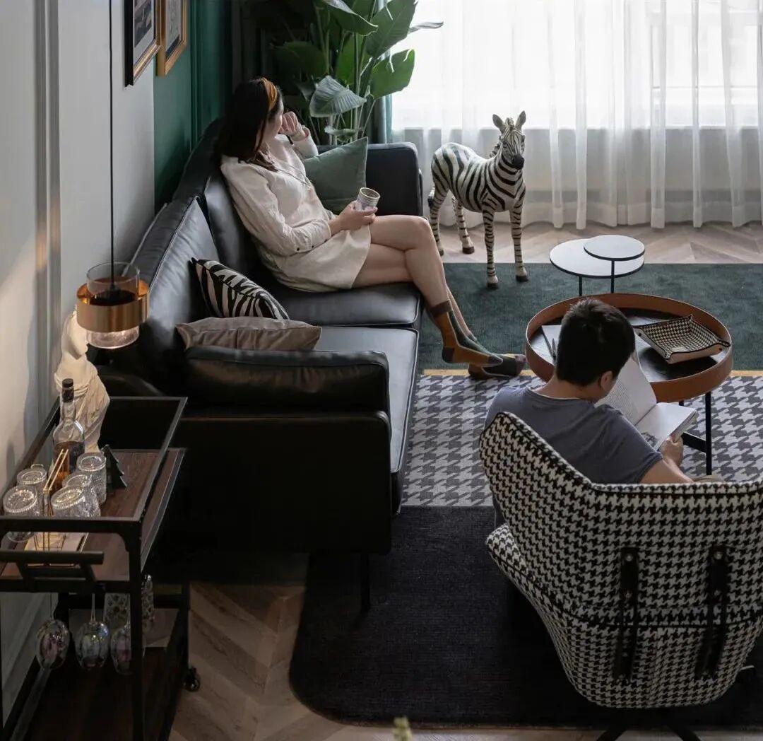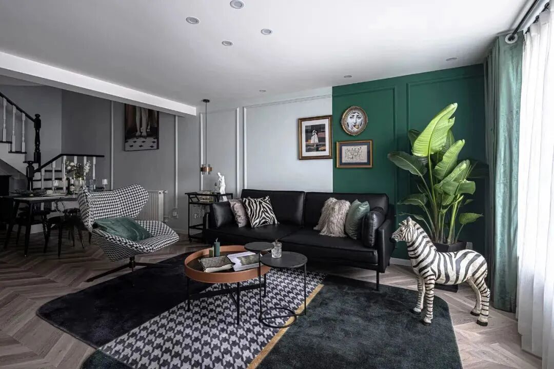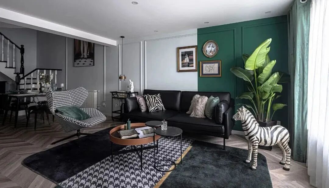 ▲ 哑黑皮质的沙发高端质感,复古茶几既与沙发呼应,又巧妙地加入了雅致的棕色。一旁的斑马摆件增加现代元素,绿植给空间带来浓郁生机。