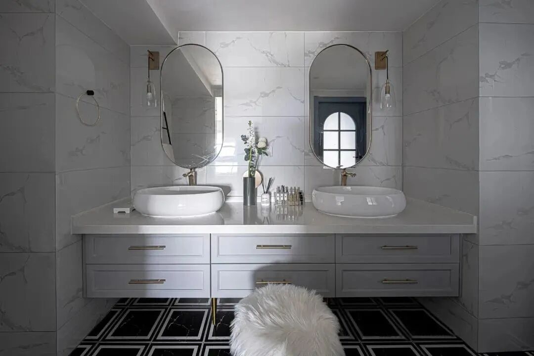 ▲ 墙面两侧各设一盏壁灯,与自带ins风的椭圆镜相印成趣。双台盆之间充当小型梳妆台,抽屉可以用来收纳化妆品,保持台面的干净整洁。
