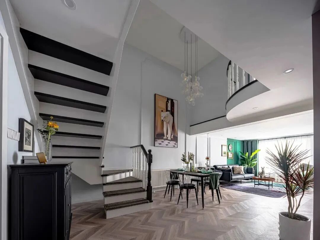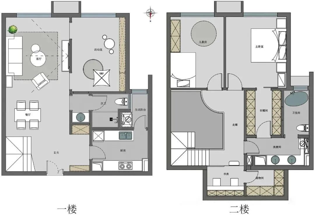 ▲ 本案例户型为复式楼设计,一层作为公共空间,客厅厨房卫生间;二层作为私密空间,卧室书房衣帽间;动静分区更明确。