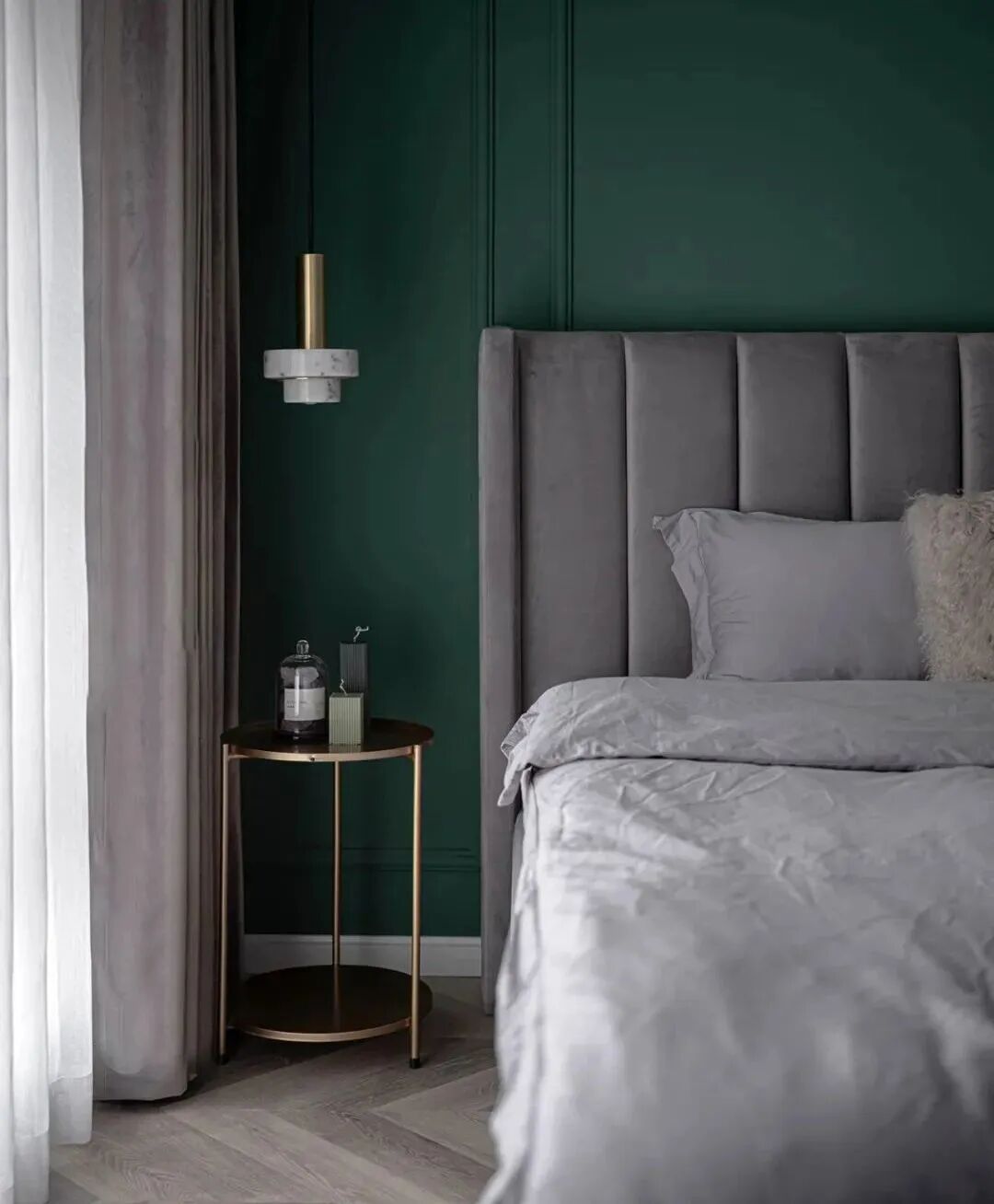 ▲ 墨绿色搭配灰色软包竖纹床头,一盏金属与大理石结合的吊灯点亮卧室空间,配以简约金属边几,打造时尚精致的复古卧室。