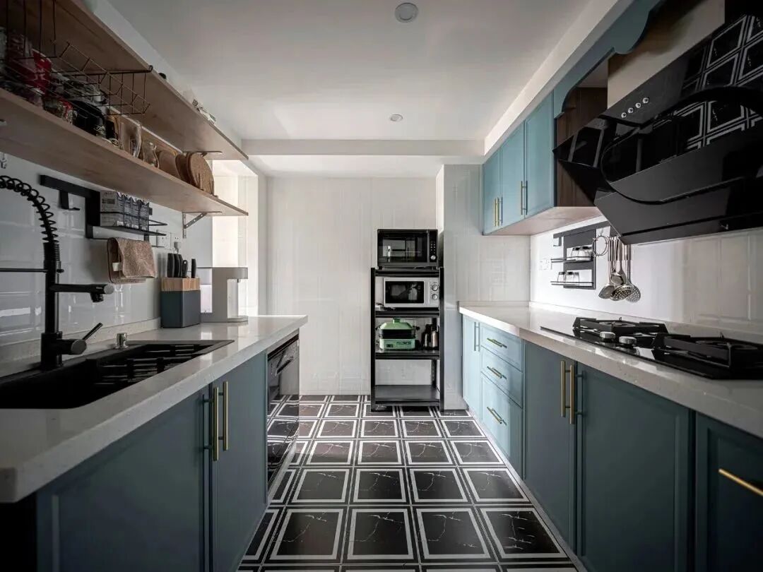 ▲ 厨房,地面铺贴复古黑白地砖,蓝色橱柜点缀金属把手。一侧取消吊柜设计,改以双层隔板满足置物需求,无形中做了分区收纳厨具。