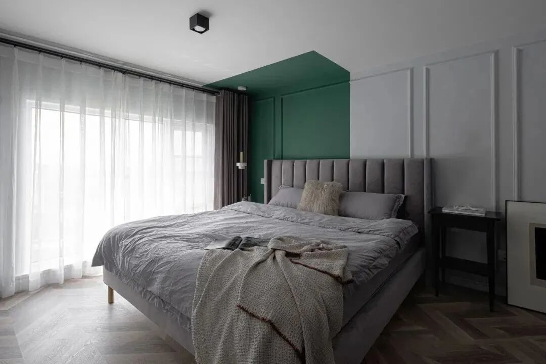 ▲ 主卧空间延续了公场域的墨绿系风格,色块延伸至顶面,拉伸空间视觉。同时结合浅灰元素,打造一个兼具沉稳内嵌气质和古典表象的空间。