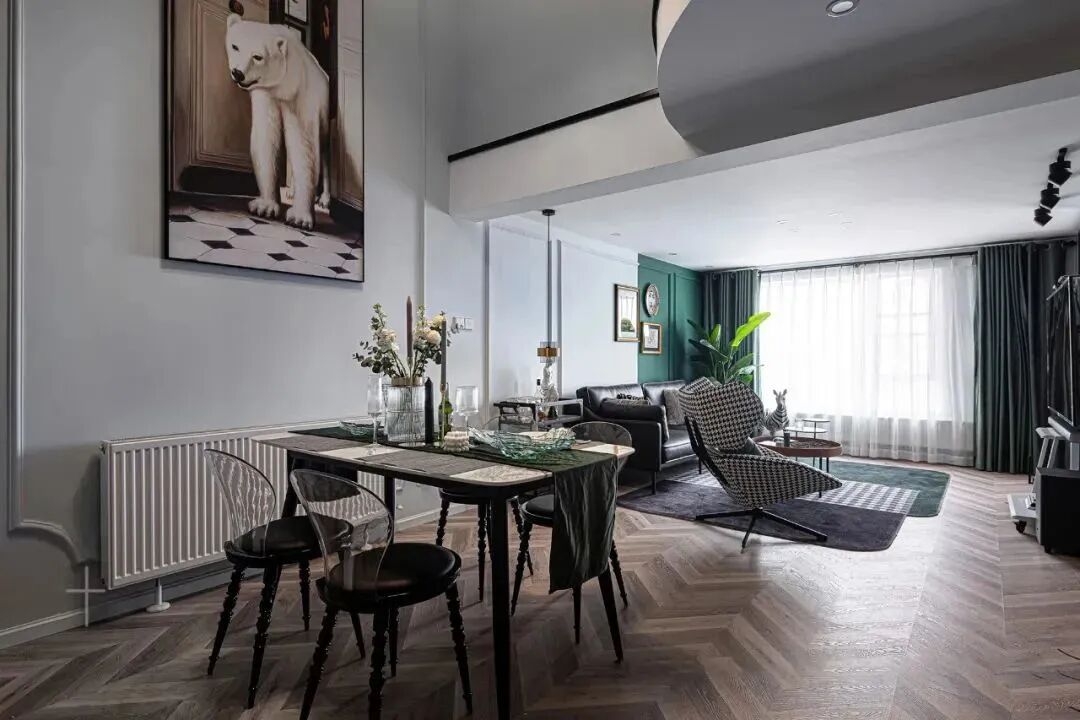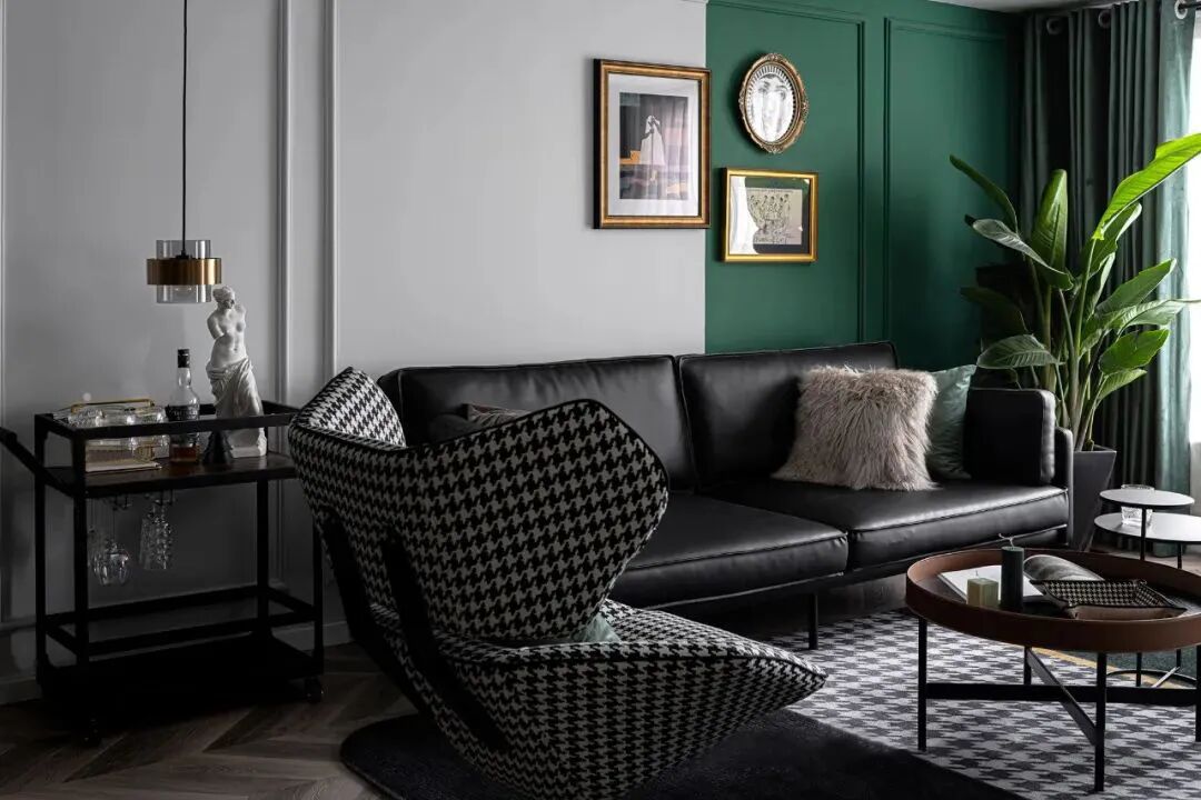 ▲ 沙发背景墙用墨绿色拼色墙设计,精致石膏线条装点出法式复古氛围。千鸟格单椅复古时尚,金属边框装饰画点染家居艺术范。
