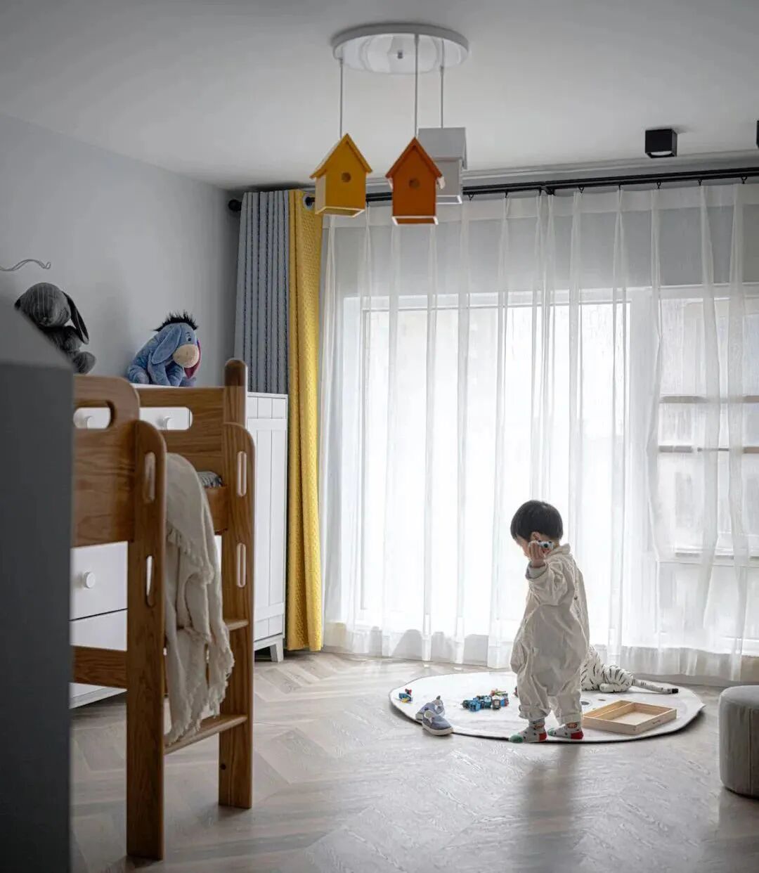 ▲ 儿童房色彩搭配丰富,家具上选用原木高低床与成品柜,童趣的房子造型吊顶灯饰,一同打造出一个温馨且元素丰富的空间。
