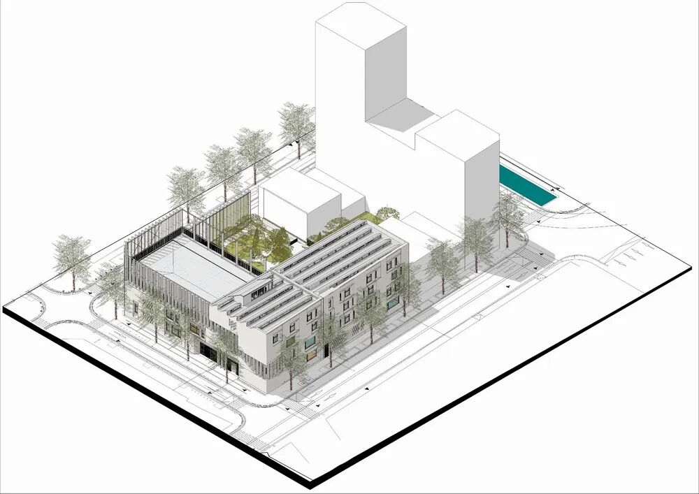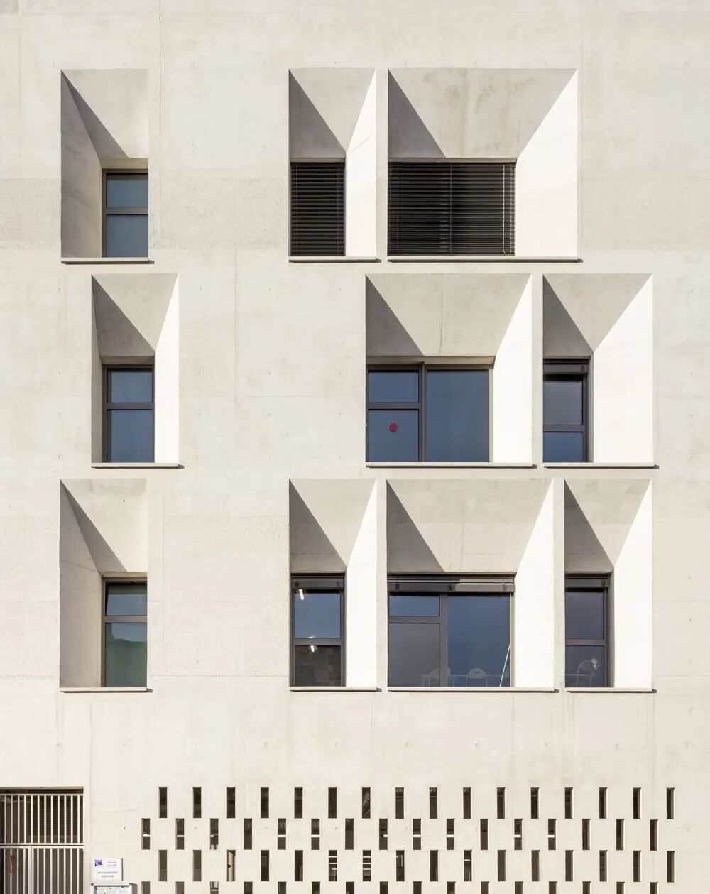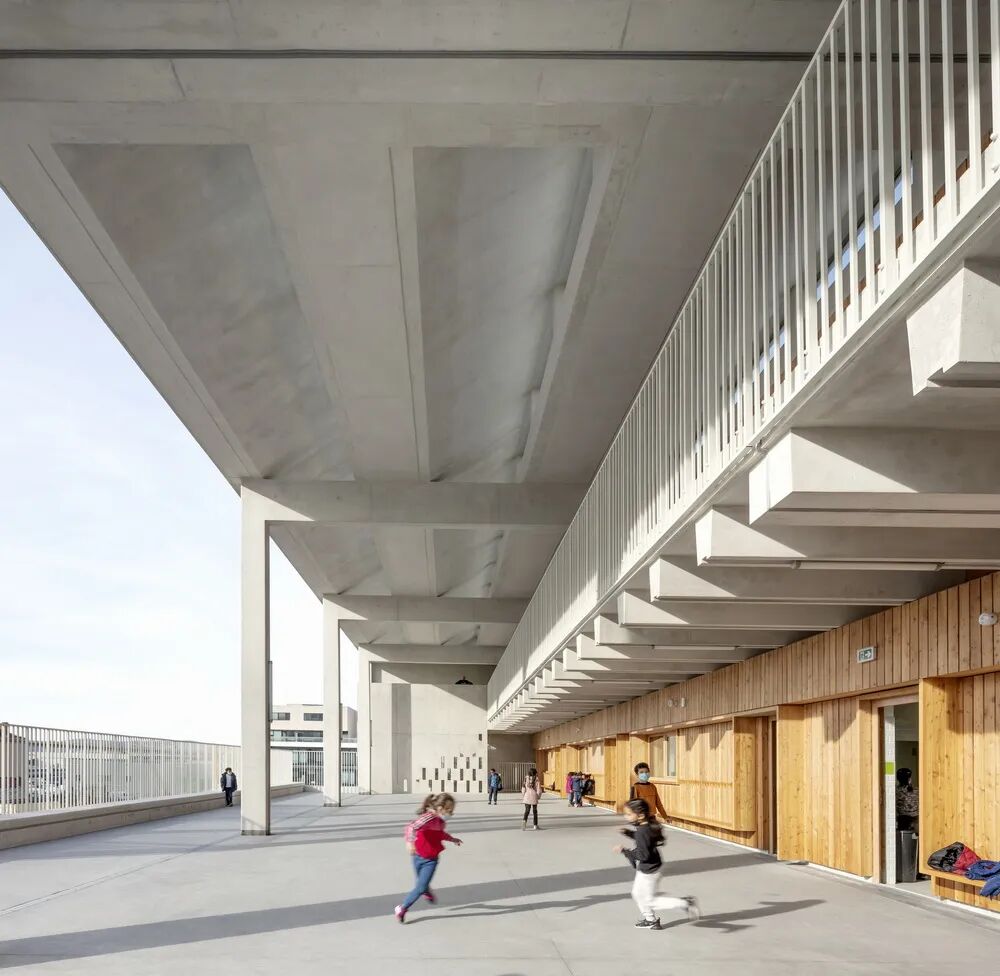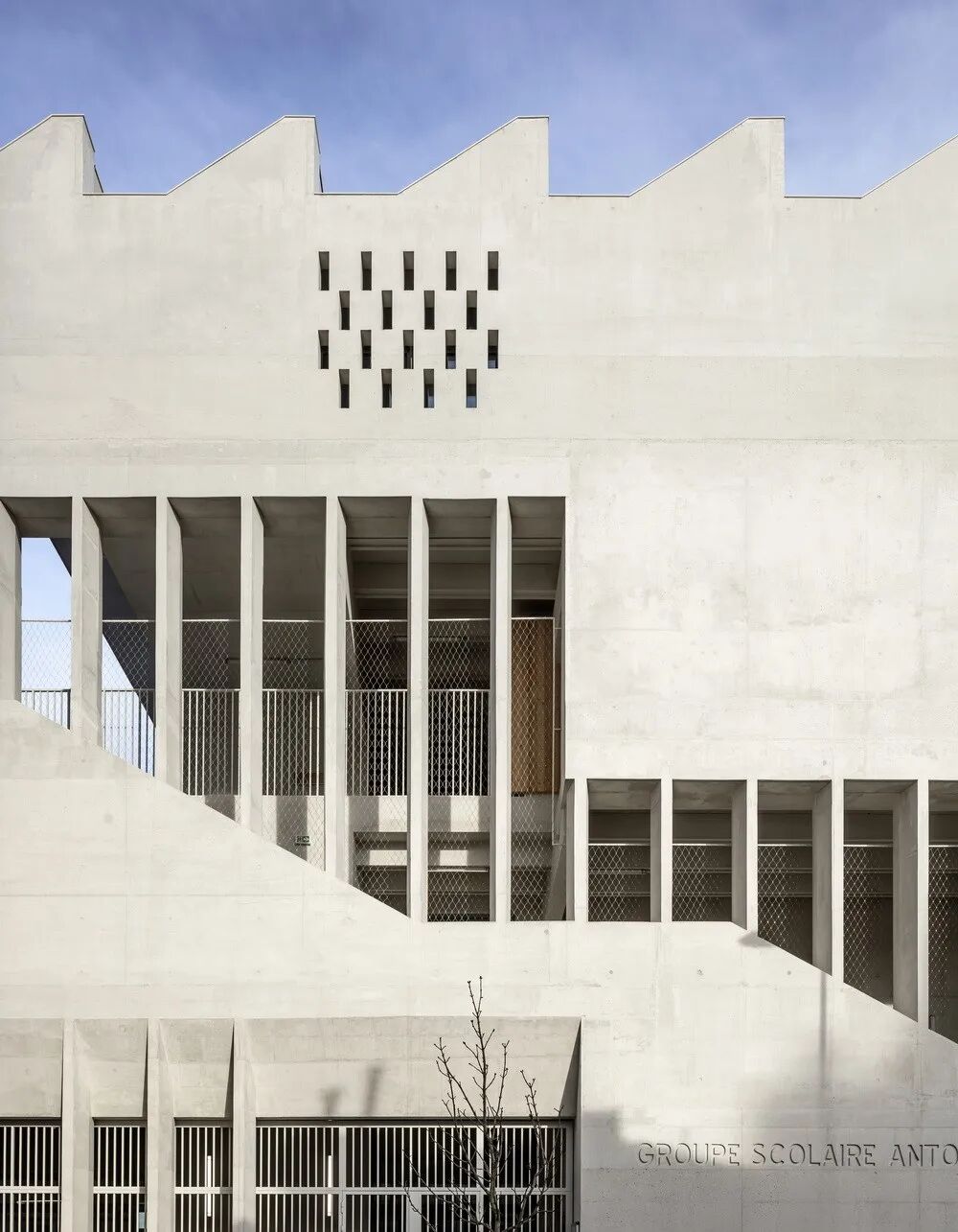 项目用易维护而美观的设计,尝试成为“让孩子喜欢上学”的空间。它容纳了22间教室和公共区域,具有严格的几何形状和壮观的体量。它的浅色混凝土立面采用雕刻塑造,这种厚度的镂空作品在港口一侧形成了柱廊,在城市一侧形成了宏伟的楼梯,在其斜墙中创造了光与影的相互掩映。