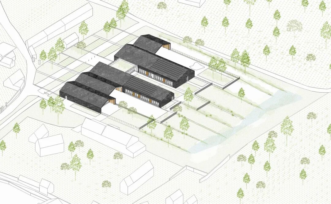 场地的地理环境决定了工程的植入方式,房屋根据土地的轮廓插入,同时考虑到保护自然土壤。这些准则划定了操场的范围,加入了果园,并成为收集整个场地雨水的山谷,为下面的一个景观盆地提供水源。
