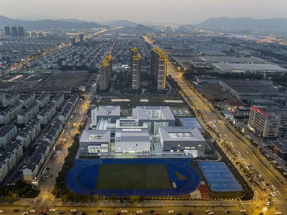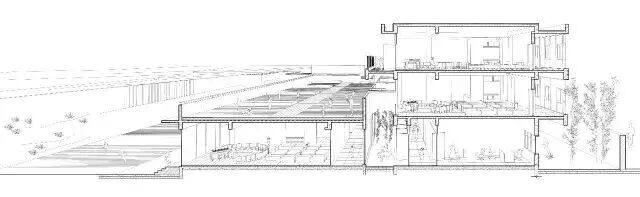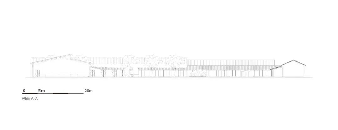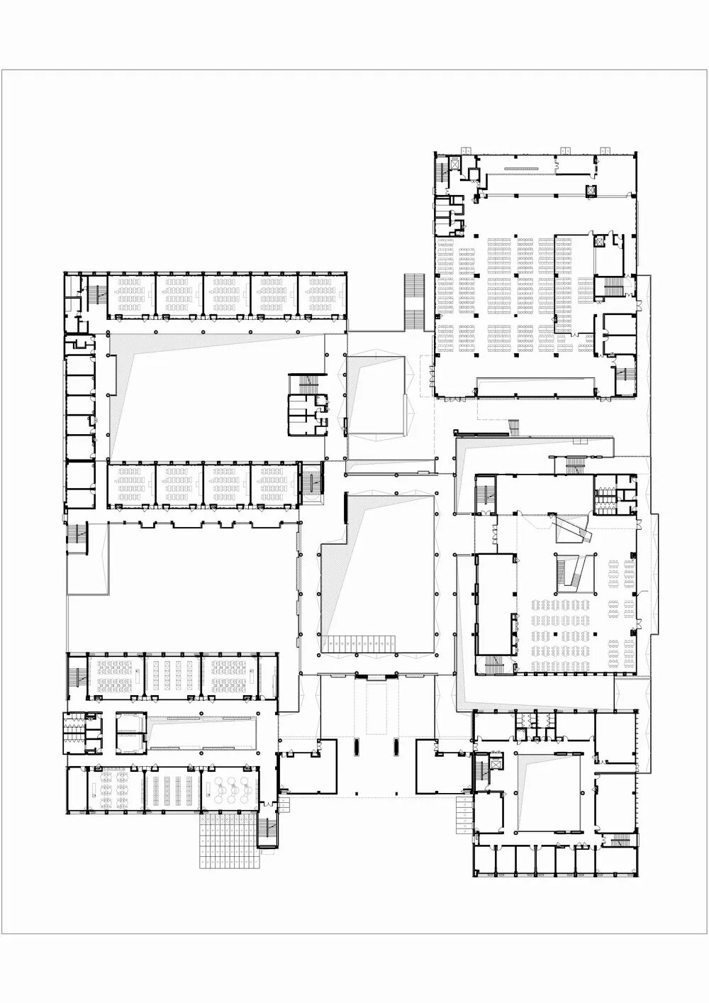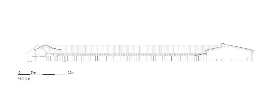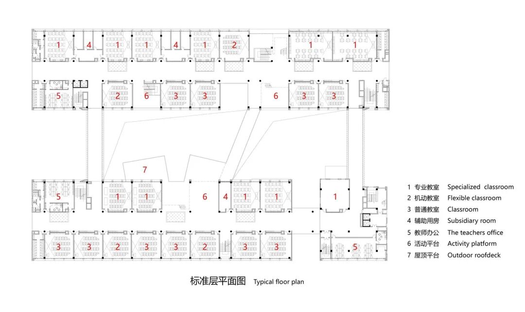 项目用地条件比较宽松,在低容积率条件下,则有机会降低建筑的高度与层数,这样做的最大好处是拉近了教室与室外地面的距离,便于学生课间室外活动,降低层数也有利于地震、火灾等紧急情况下的疏散,更有利于学生安全。因此设计采用低层高密度的策略,让整个教学区仅控制在两层,横向展开,形成一座毯式建筑。