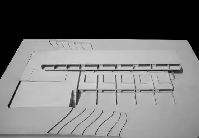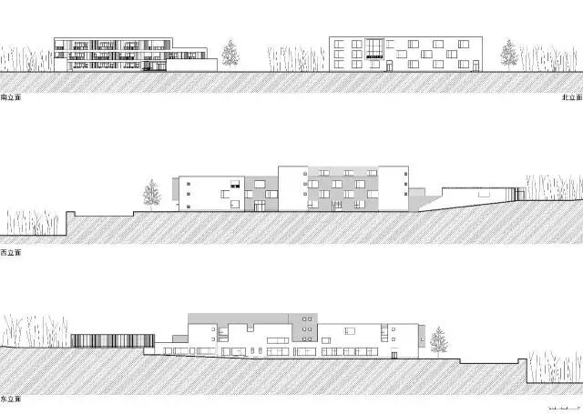 方案试图尽量降低建筑体量,将幼儿园做得低矮。入口处,利用地形高差进行立体交通组织,从西面二层进入,门厅在二层,人流通过大平台进入幼儿园,保证交通距离最短,从地面上看只有两层高。进一步把入口层体积退后,让第二层盒子漂浮在空中,进一步分解体积,从视觉上让建筑的高度降低到一层。这一系列处理的目的都是弱化建筑体积,增加亲切感,减小建筑对幼儿和儿童的压迫感。