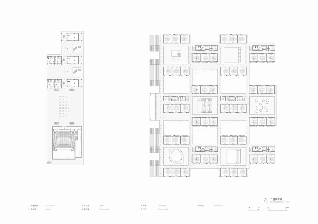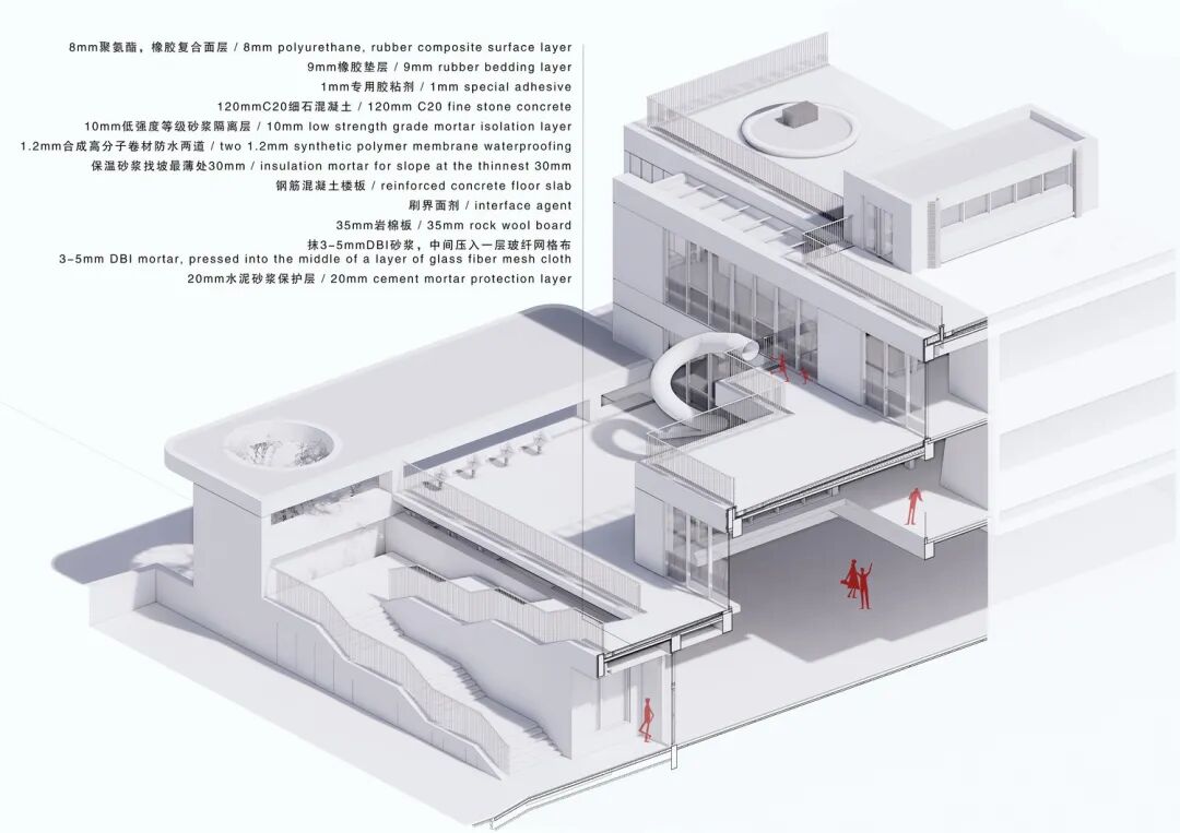 项目采用减法方式,在密集的教室阵列中“掏洞”并增加公共联桥,创造出一个空间立体循环的“∞”型非正式交往公共空间体系。在这些尺度宜人的“空洞”里,又通过色彩活泼的楼梯、平台和小建筑营造出多变的个性空间体验,将校园创造成能不断激发孩子们好奇心和想象力的奇妙场所。而这些个“空洞”也让自然界的光和风有机会漫进建筑的中央,和学生们的活动融和交集。