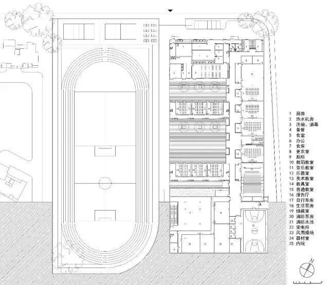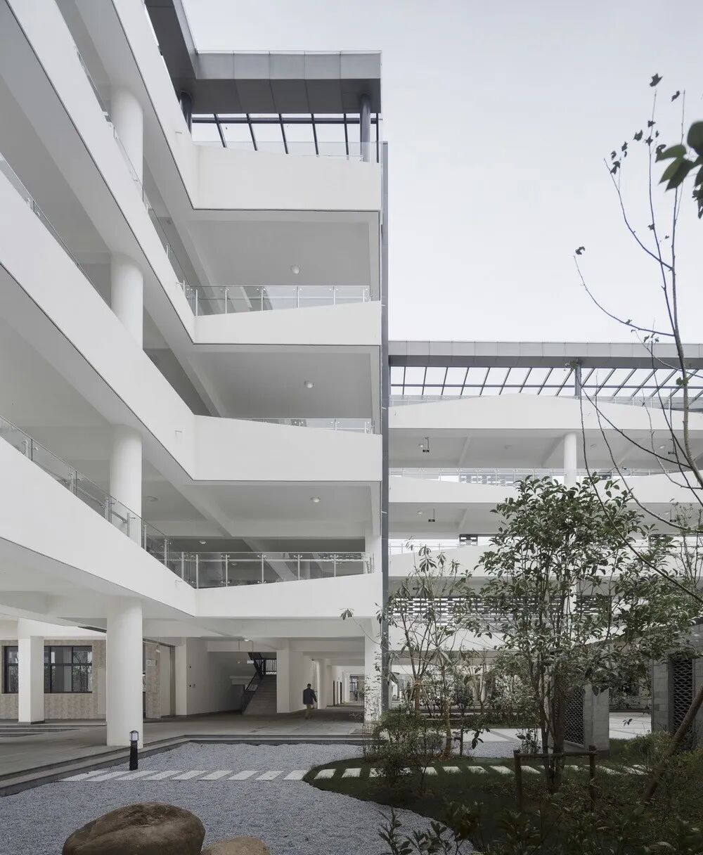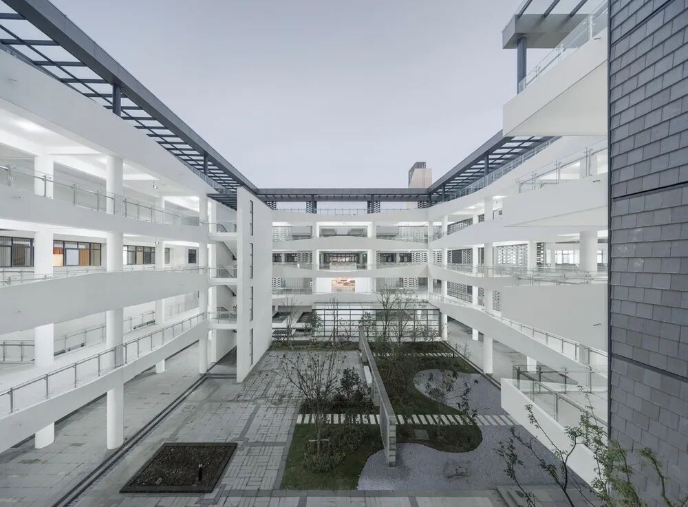第四中学建筑群根据功能不同划分为5个内聚的院落,包括教学院落、实验院落、图书院落及体育院落。一个核心院落位于所有功能的中心,再通过廊道连接其他的功能院落。通过建筑体量围合入口空间和行进路线,学校由南向北通过校前广场,前院,中心院落,后院,把校园文化的仪式感建立了起来。
