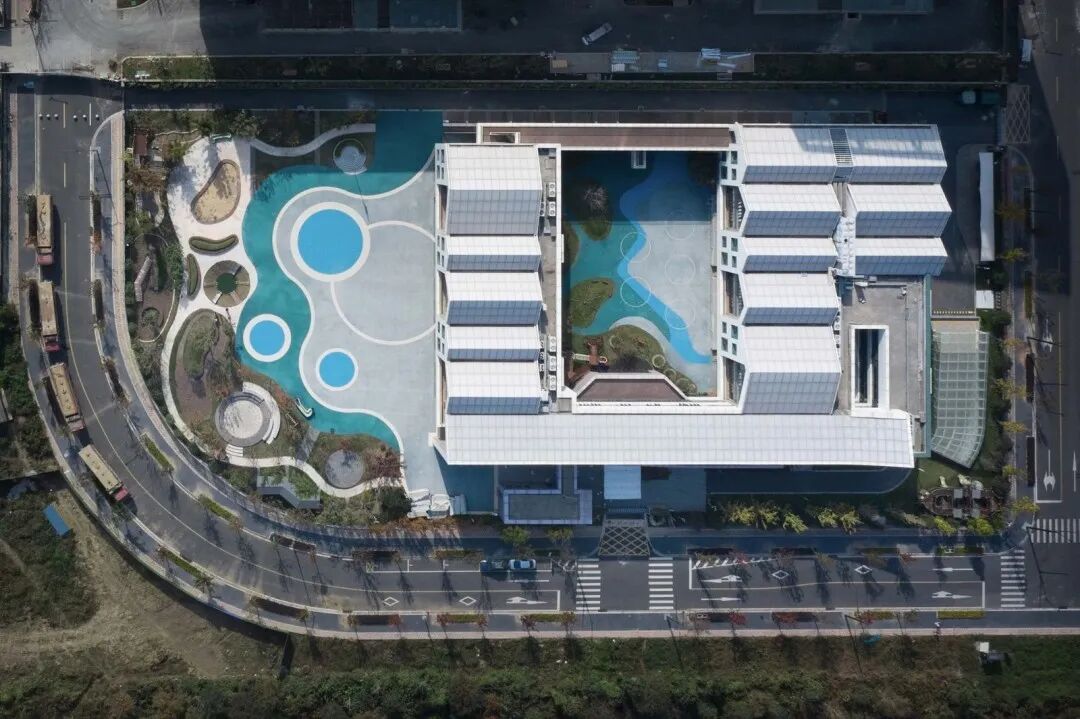 项目位于一处高差复杂的坡地之上,四周由高层住宅环绕。结合场地条件和建筑功能,幼儿园以梯田为主要概念,层层设置退台,用户外台阶和儿童滑梯将地面操场以及各层屋顶联通成为一个完整的户外活动场地。