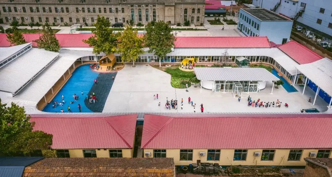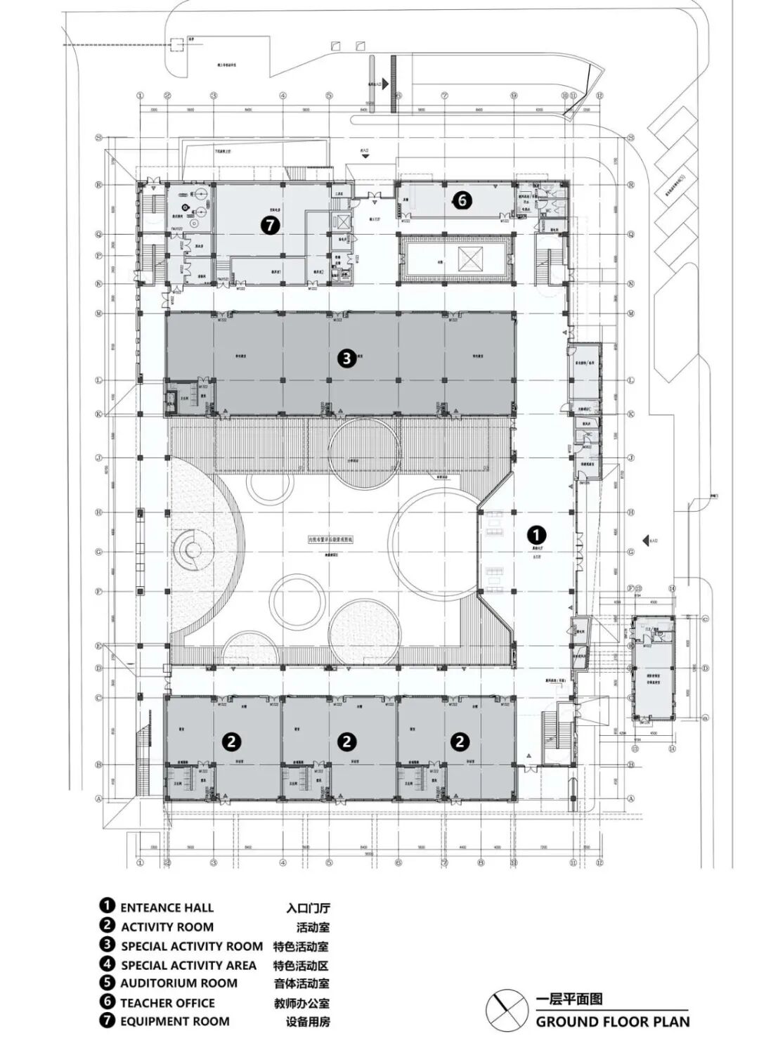 项目为改造项目,设计引入一个有顶的环状走廊,将新旧不同的学习空间连接起来,让园内各种分散的空间元素编织为一体。环就像一个大的社会凝聚器,根据不同的课程与兴趣,不同年龄段的孩子在其中混合活动。在西侧,环与新建多功能厅连接,其内部无柱的宽敞空间可举办大型室内集体活动。而在东侧,环与大门厅相连,为家长提供等待空间。
