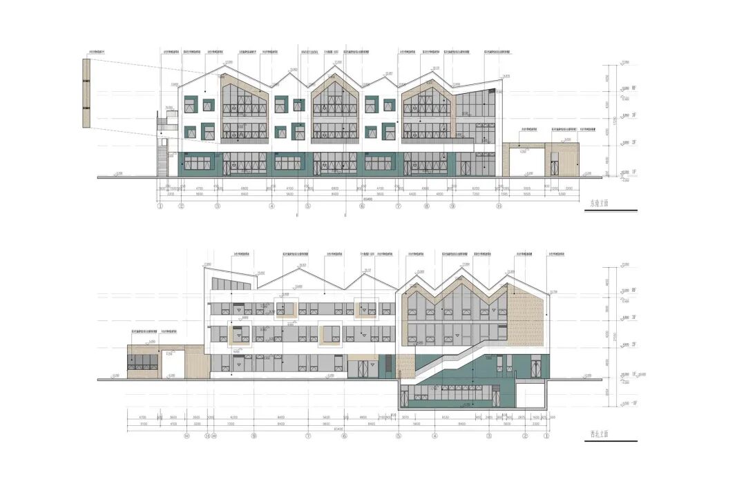 建筑造型设计的灵感来源于儿童画,感受小朋友对“房子”的第一印象,将之投射到建筑形态之中。不规则的连续坡屋顶形成有节奏的韵律;大小错落的窗洞营造随意轻松的效果;丰富的色彩唤起小朋友的认同感。