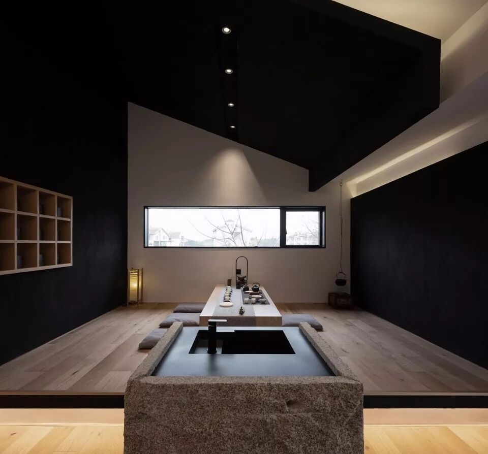在三层区域,借了一处较安静的空间作为茶室,区别于传统的茶室空间,用现代的手法构造饮茶空间,黑色的三角强化出原建筑关系,将背景退隐,以此专注于饮茶的瞬间。