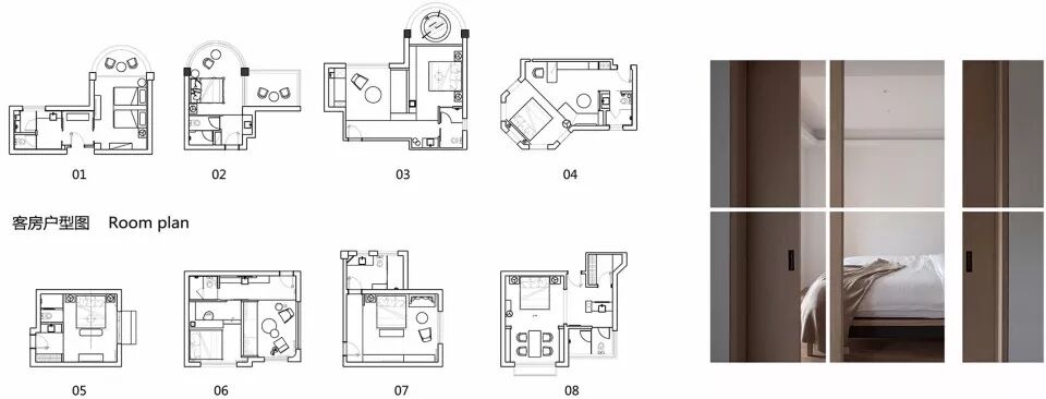 设计师针对民宿的入住功能一共设计了八间不同布置风格的客房,将入住功能布置与二三四层,重新规划房间平面,扩大每一个房间的卫生间,增加落地窗,以此增加舒适度,同时为入住的客人创造趣味性的体验。在每一层中间以中岛作为过渡,对应每一个房间,即协调客房的动线关系,又给每一位入客人提供便捷的交流空间。为与都市建筑保持距离,以原木为主基调,营造家的氛围与舒适感。