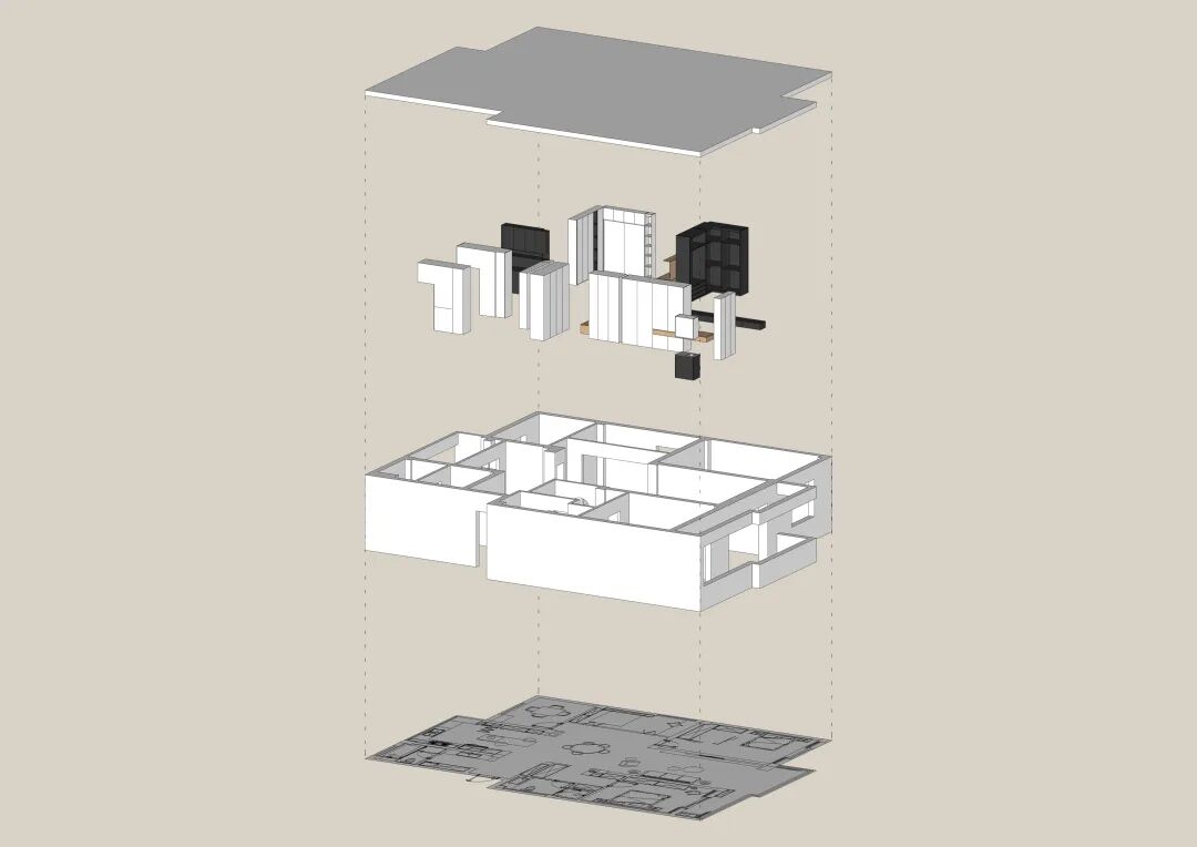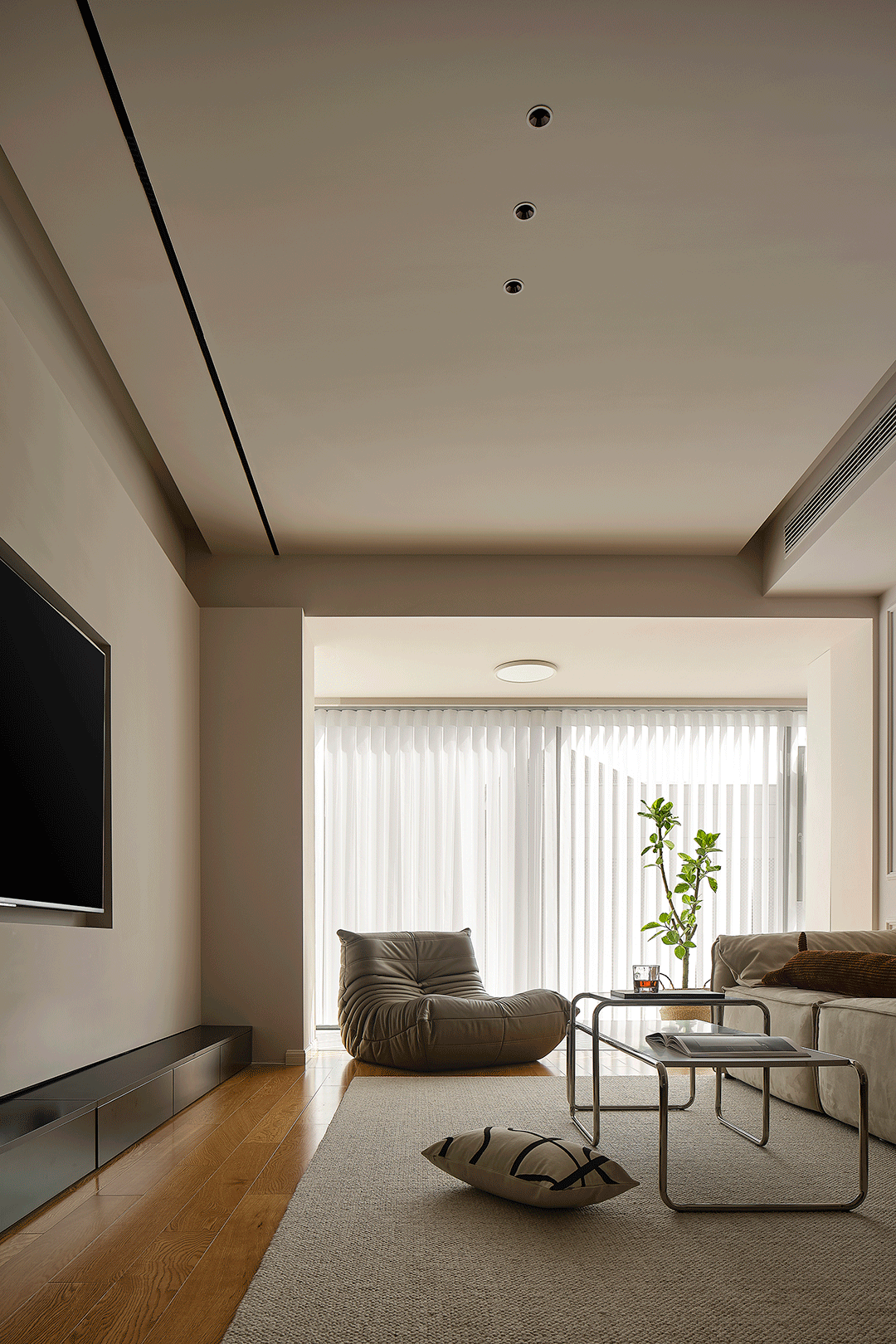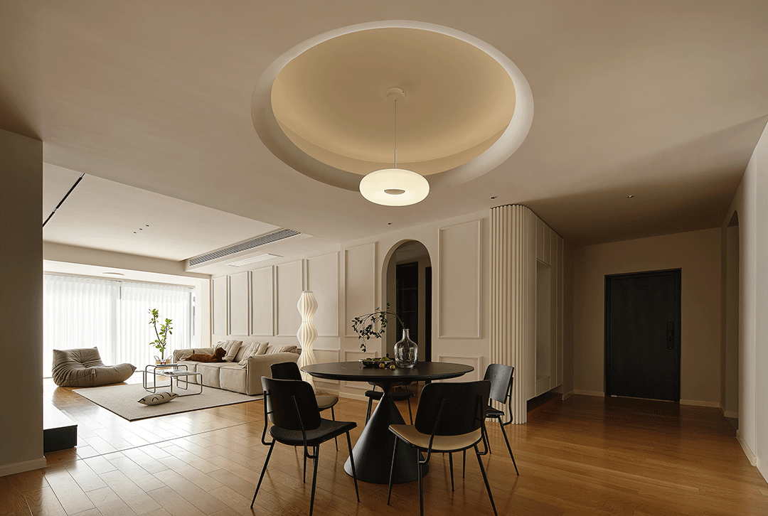 一,设计师首先将原有北侧的房间拆分出一个娱乐室和书房/临时客房,保留了本身客餐厅南北通透的大体格局,并将餐厨区域进一步细分为中西厨来增加储物空间和使用便捷性。
