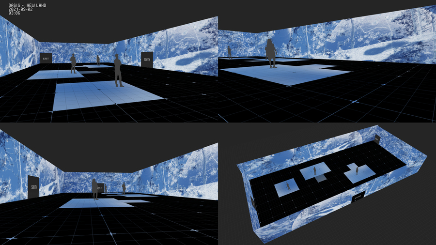 作品尺寸为35米x 16米,在创作中,艺术家使用3D扫描仪捕捉了其所在地的环境和树木。然后,数据被清理、剪切、剪裁、组合和优化,使之可以在3D空间中进行应用。随后艺术家为素材的安放创造了一个可视化的3D虚拟场景,可以清楚了解内容的分布和房间中元素的移动速度。这些模型可供创作者定期与绿洲团队沟通,向他们展示设计的进展。同时作品还制作了原创音乐作品,并将其空间化达到立体音效,以增强全方位的沉浸感。