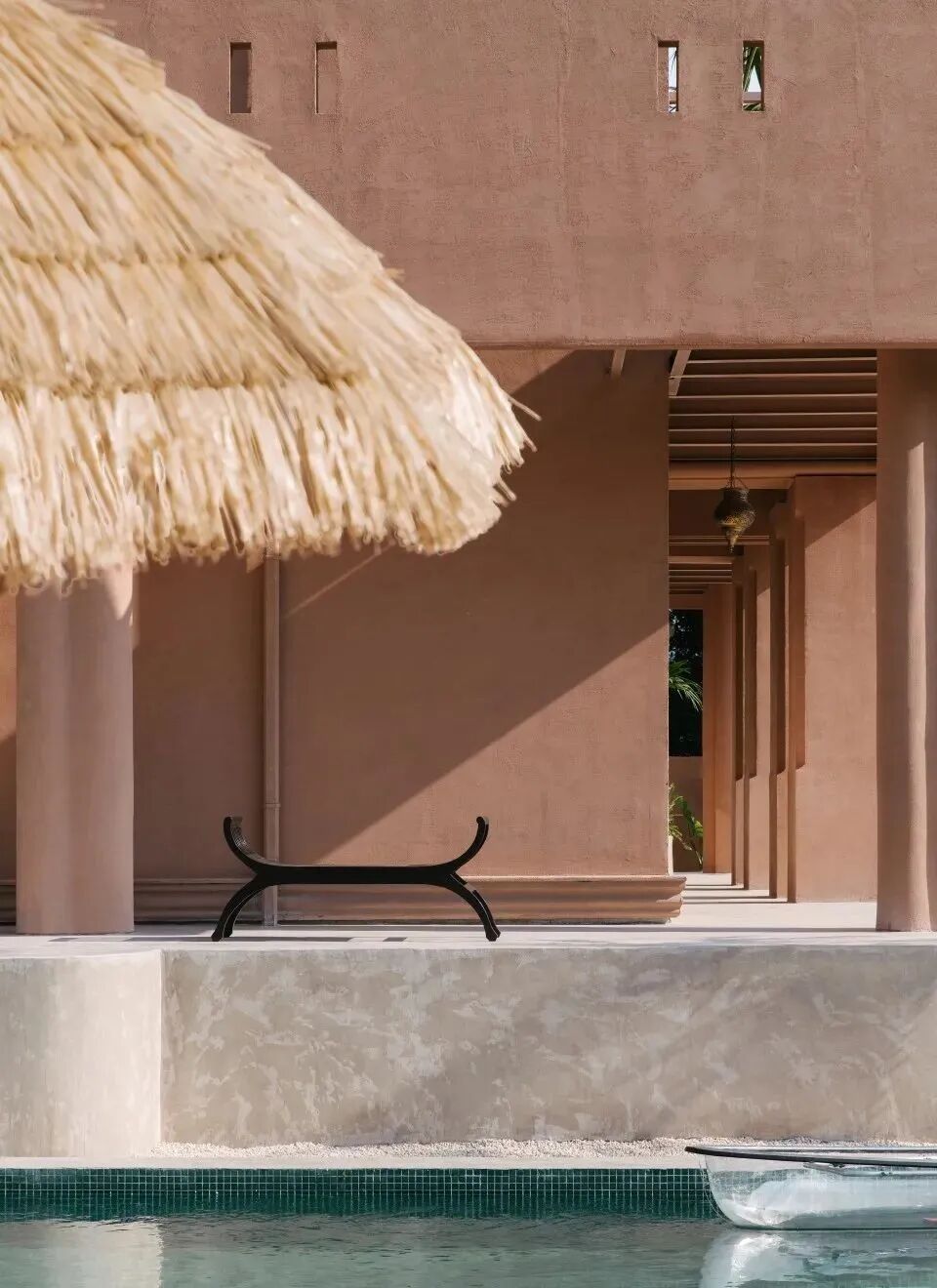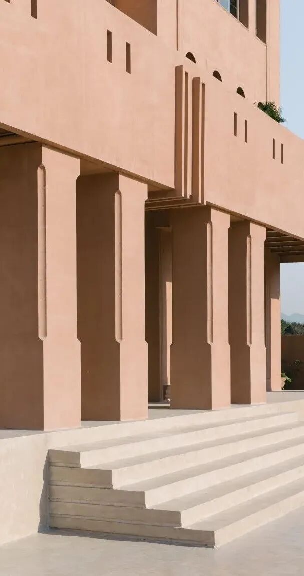建筑外墙部分,随色相推移我们取暖色来营造整体氛围。回廊根据自然情境将室内外空间连结在一起,随着天气以及白昼时刻的变化,整体建筑立面造型呈现出丰富的光影结构。阳光和水是相对互补的元素,在建筑的西侧,蓝色的蓄水泳池以水平拓展的方式缓缓展开,融入山石和绿植中。