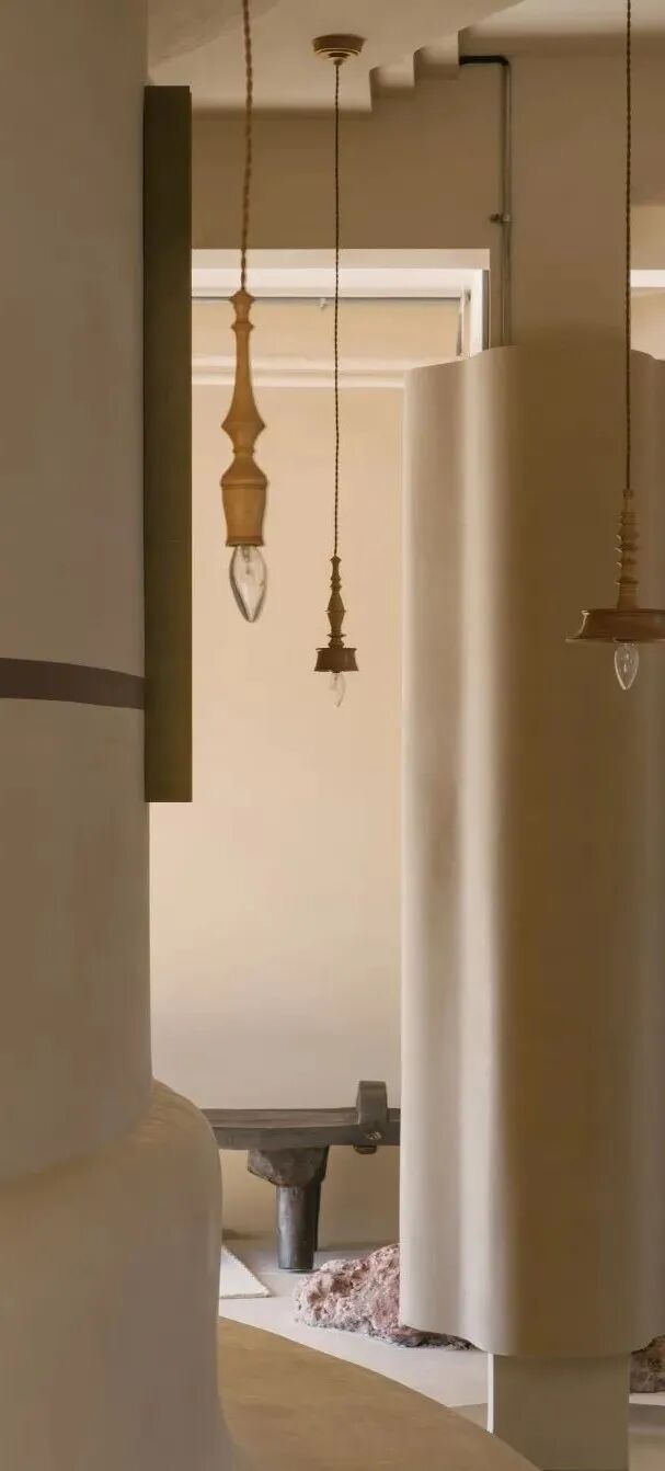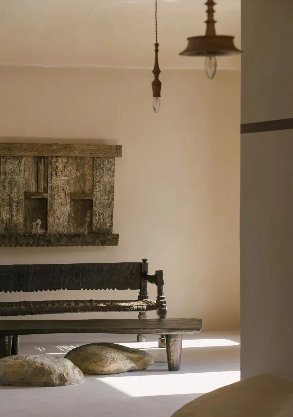 室内动态空间的组合通过区域穿行而得到不同的感知。我们在地面嵌入自然原石,与室外的自然景观相互贯通,古老的家具和早已风化的木材通过相对平静的墙地面得以完美展现。
