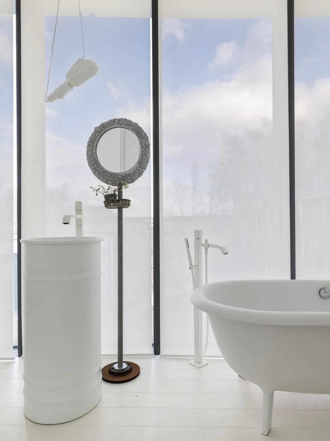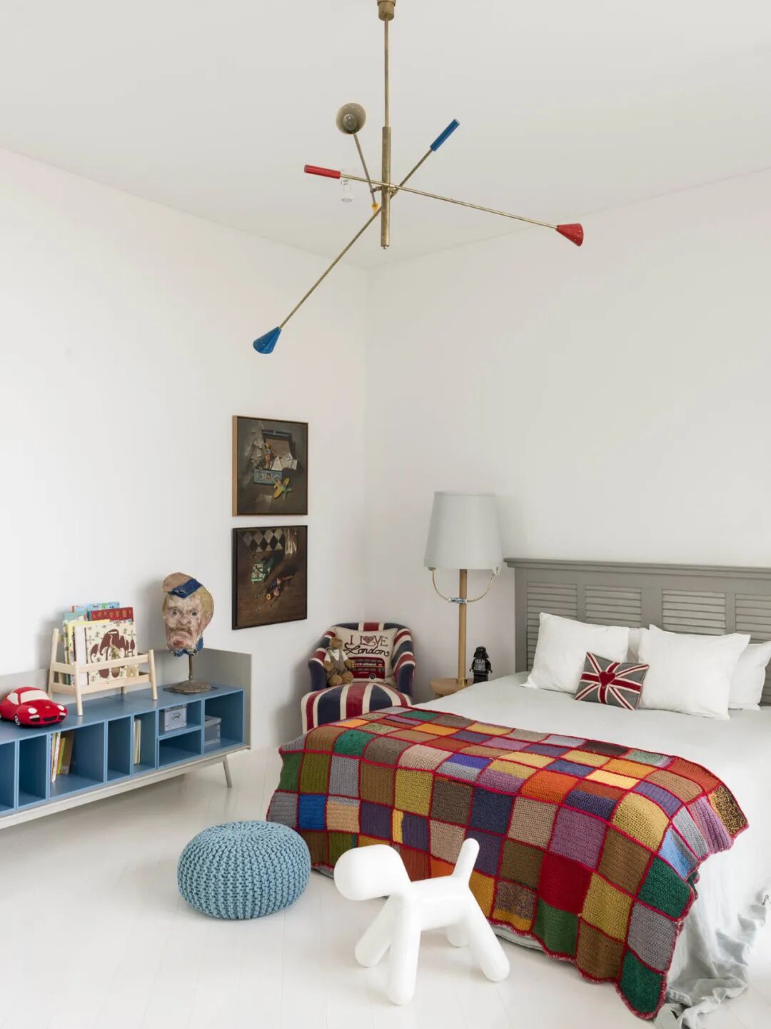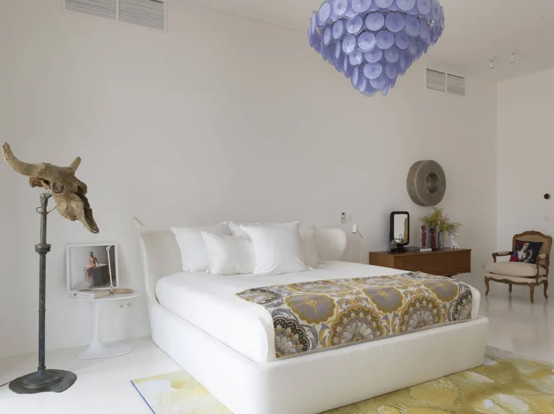 卧室和浴室呈现出与家中其他部分相似的设计美学。它们以时尚简约的家具和引人注目的装饰件为特色。空间不拘一格,采用白色调色板和大胆的流行色。主卧室有一张B&B Italia的床、一张Moooi的地毯、一把Roche Bobois的扶手椅和一盏巴黎的复古吊灯。